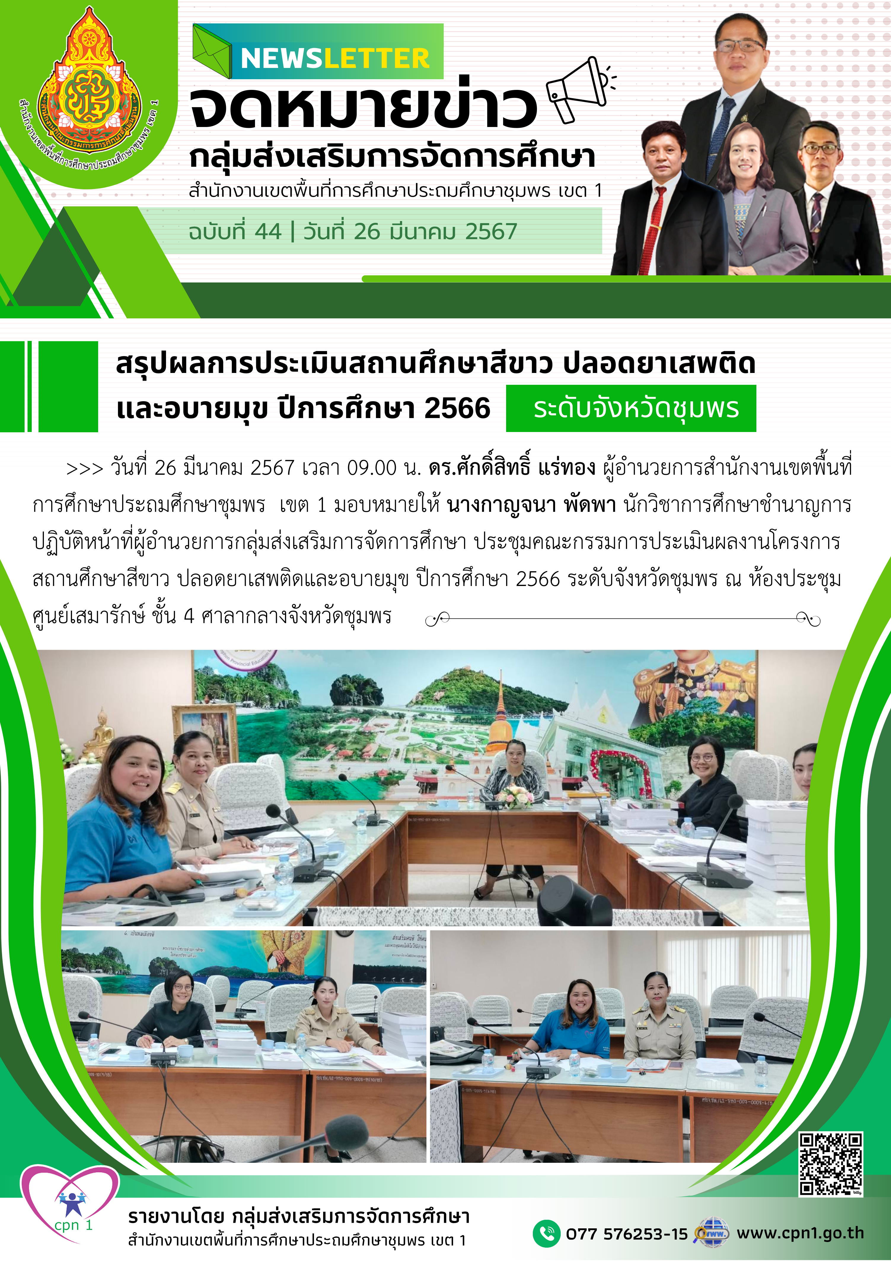 วันที่ 26 มีนาคม 2567 เวลา 09.00 น. ดร.ศักดิ์สิทธิ์ แร่ทอง ผู้อำนวยการสำนักงานเขตพื้นที่การศึกษาประถมศึกษาชุมพร เขต 1 มอบหมายให้ นางกาญจนา พัดพา นักวิชาการศึกษาชำนาญการ ปฏิบัติหน้าที่ผู้อำนวยการกลุ่มส่งเสริมการจัดการศึกษา ประชุมคณะกรรมการประเมินผลงานโครงการสถานศึกษาสีขาว ปลอดยาเสพติดและอบายมุข ปีการศึกษา 2566 ระดับจังหวัดชุมพร ณ ห้องประชุมศูนย์เสมารักษ์ ชั้น 4 ศาลากลางจังหวัดชุมพร