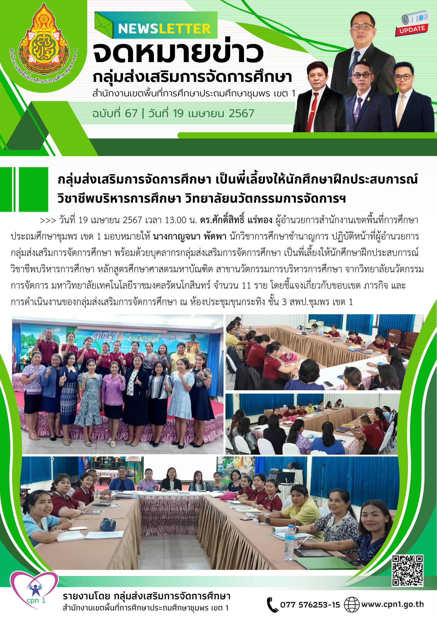 >>> วันที่ 19 เมษายน 2567 เวลา 13.00 น. ดร.ศักดิ์สิทธิ์ แร่ทอง ผู้อำนวยการสำนักงานเขตพื้นที่การศึกษาประถมศึกษาชุมพร เขต 1 มอบหมายให้ นางกาญจนา พัดพา นักวิชาการศึกษาชำนาญการ ปฏิบัติหน้าที่ผู้อำนวยการกลุ่มส่งเสริมการจัดการศึกษา พร้อมด้วยบุคลากรกลุ่มส่งเสริมการจัดการศึกษา เป็นพี่เลี้ยงให้นักศึกษาฝึกประสบการณ์วิชาชีพบริหารการศึกษา หลักสูตรศึกษาศาสตรมหาบัณฑิต สาขานวัตกรรมการบริหารการศึกษา จากวิทยาลัยนวัตกรรมการจัดการ มหาวิทยาลัยเทคโนโลยีราชมงคลรัตนโกสินทร์ จำนวน 11 ราย โดยชี้แจงเกี่ยวกับขอบเขต ภารกิจ และการดำเนินงานของกลุ่มส่งเสริมการจัดการศึกษา ณ ห้องประชุมขุนกระทิง ชั้น 3 สพป.ชุมพร เขต 1