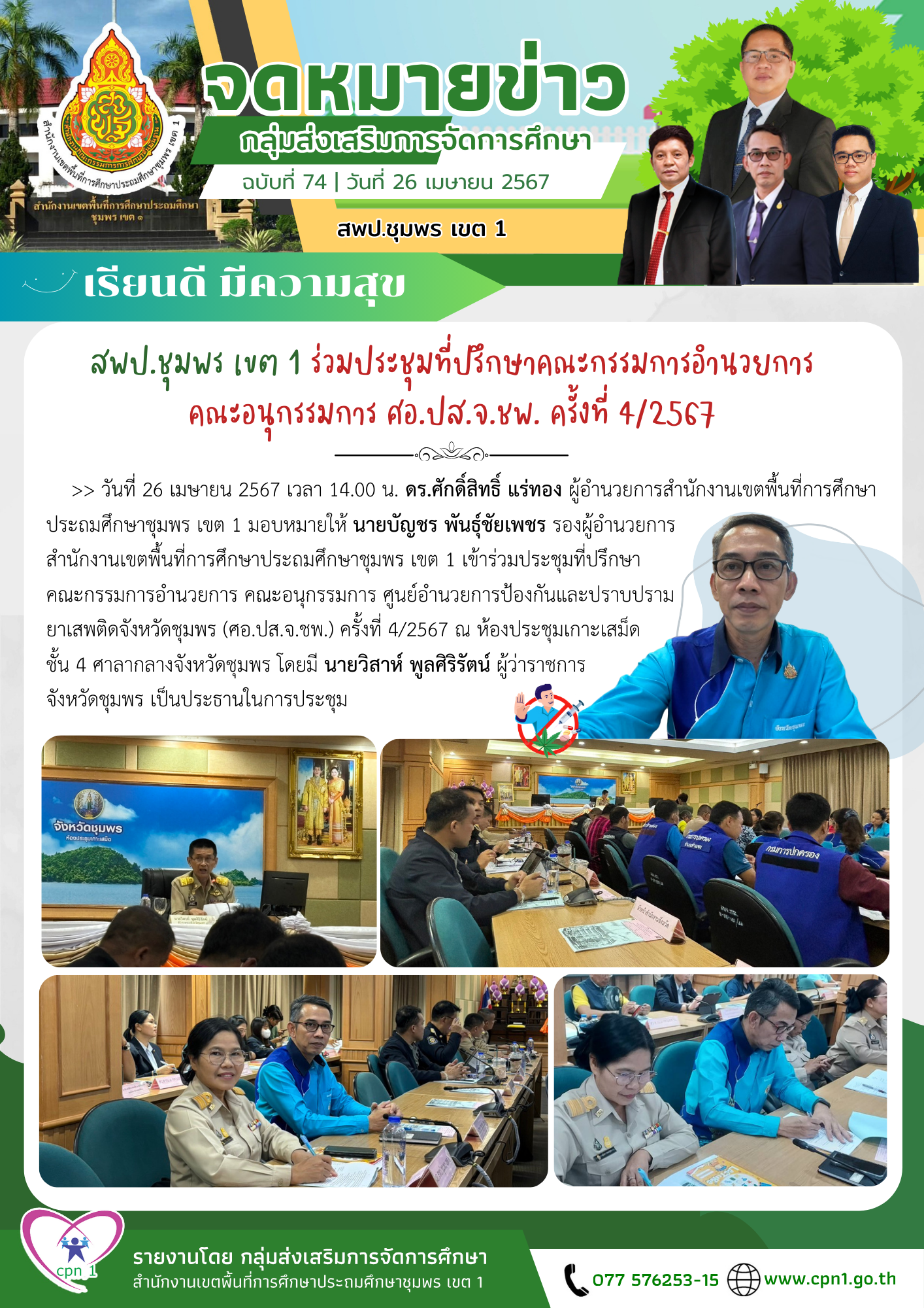 >> วันที่ 26 เมษายน 2567 เวลา 14.00 น. ดร.ศักดิ์สิทธิ์ แร่ทอง ผู้อำนวยการสำนักงานเขตพื้นที่การศึกษาประถมศึกษาชุมพร เขต 1 มอบหมายให้ นายบัญชร พันธุ์ชัยเพชร รองผู้อำนวยการสำนักงานเขตพื้นที่การศึกษาประถมศึกษาชุมพร เขต 1 เข้าร่วมประชุมที่ปรึกษาคณะกรรมการอำนวยการ คณะอนุกรรมการ ศูนย์อำนวยการป้องกันและปราบปรามยาเสพติดจังหวัดชุมพร (ศอ.ปส.จ.ชพ.) ครั้งที่ 4/2567 ณ ห้องประชุมเกาะเสม็ด ชั้น 4 ศาลากลางจังหวัดชุมพร โดยมี นายวิสาห์ พูลศิริรัตน์ ผู้ว่าราชการจังหวัดชุมพร เป็นประธานในการประชุม