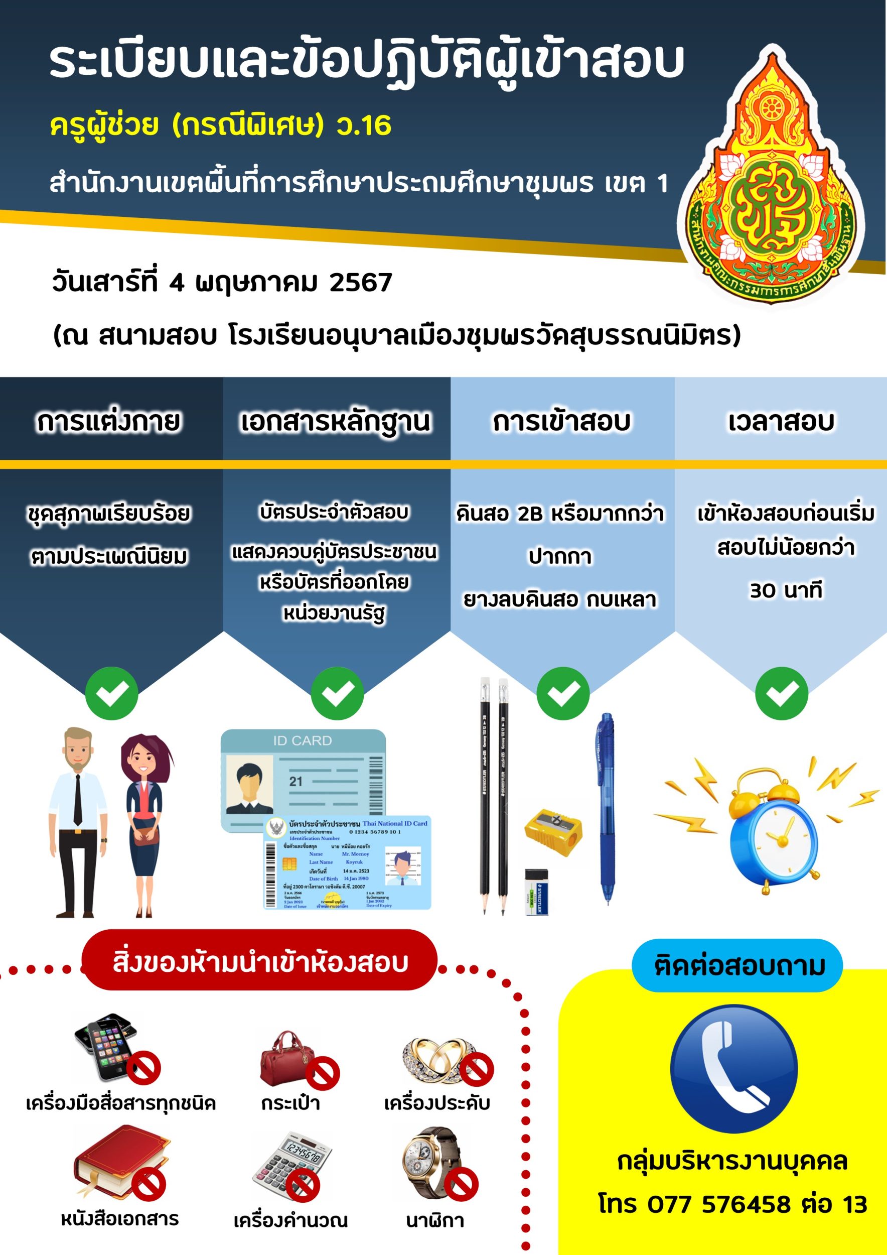 ระเบียบการปฏิบัติของผู้เข้าสอบคัดเลือกเพื่อบรรจุและแต่งตั้งเข้ารับราชการเป็นข้าราชการครูและบุคลากรทางการศึกษา ตำแหน่งครูผู้ช่วย กรณีที่มีความจำเป็นหรือมีเหตุพิเศษ สังกัด สพฐ. ปี พ.ศ.2567 02 พฤษภาคม 256702 พฤษภาคม 2024 กลุ่มบริหารงานบุคคล สพป.ชพ.1 ข่าวและกิจกรรมกลุ่มบริหารงานบุคคล FacebookFacebookXXLINELine กลุ่มบริหารงานบุคคล สพป.ชพ.1