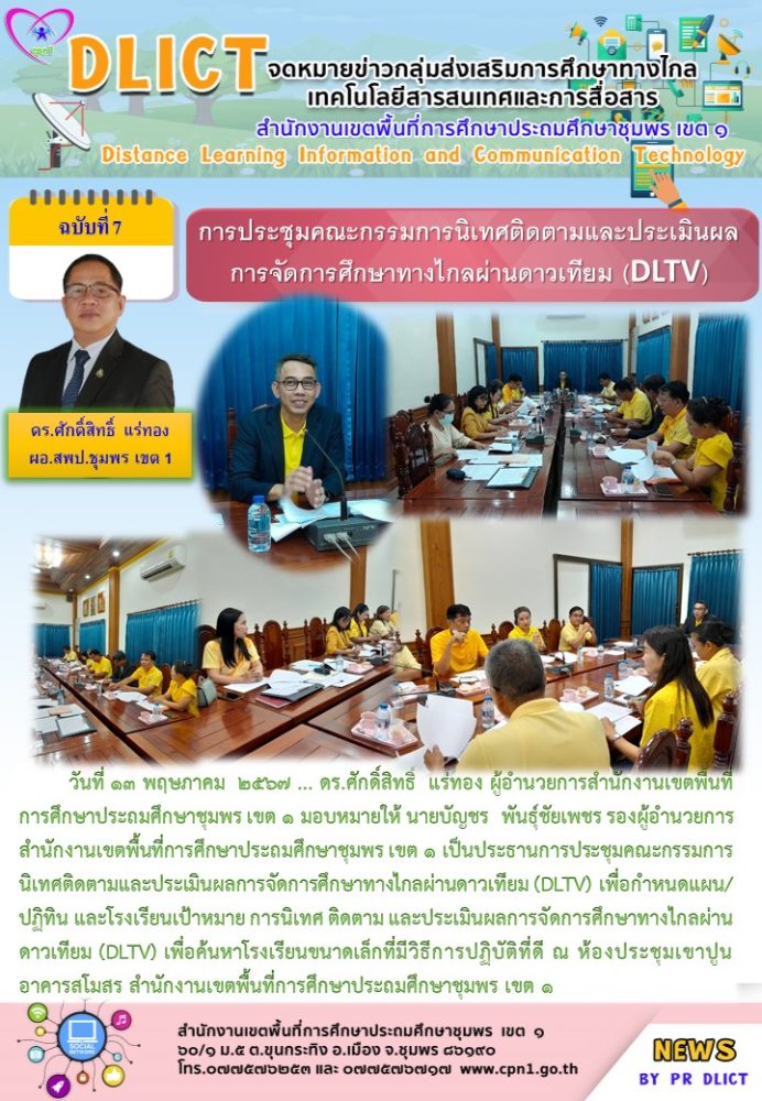 วันที่ 13 พฤษภาคม 2567 … ดร.ศักดิ์สิทธิ์ แร่ทอง ผู้อำนวยการสำนักงานเขตพื้นที่การศึกษาประถมศึกษาชุมพร เขต 1 มอบหมายให้ นายบัญชร พันธุ์ชัยเพชร รองผู้อำนวยการสำนักงานเขตพื้นที่การศึกษาประถมศึกษาชุมพร เขต 1 เป็นประธานการประชุมคณะกรรมการนิเทศติดตามและประเมินผลการจัดการศึกษาทางไกลผ่านดาวเทียม (DLTV) เพื่อกำหนดแผน/ปฏิทิน และโรงเรียนเป้าหมาย การนิเทศ ติดตาม และประเมินผลการจัดการศึกษาทางไกลผ่านดาวเทียม (DLTV) เพื่อค้นหาโรงเรียนขนาดเล็กที่มีวิธีการปฏิบัติที่ดี ณ ห้องประชุมเขาปูน อาคารสโมสร สำนักงานเขตพื้นที่การศึกษาประถมศึกษาชุมพร เขต 1