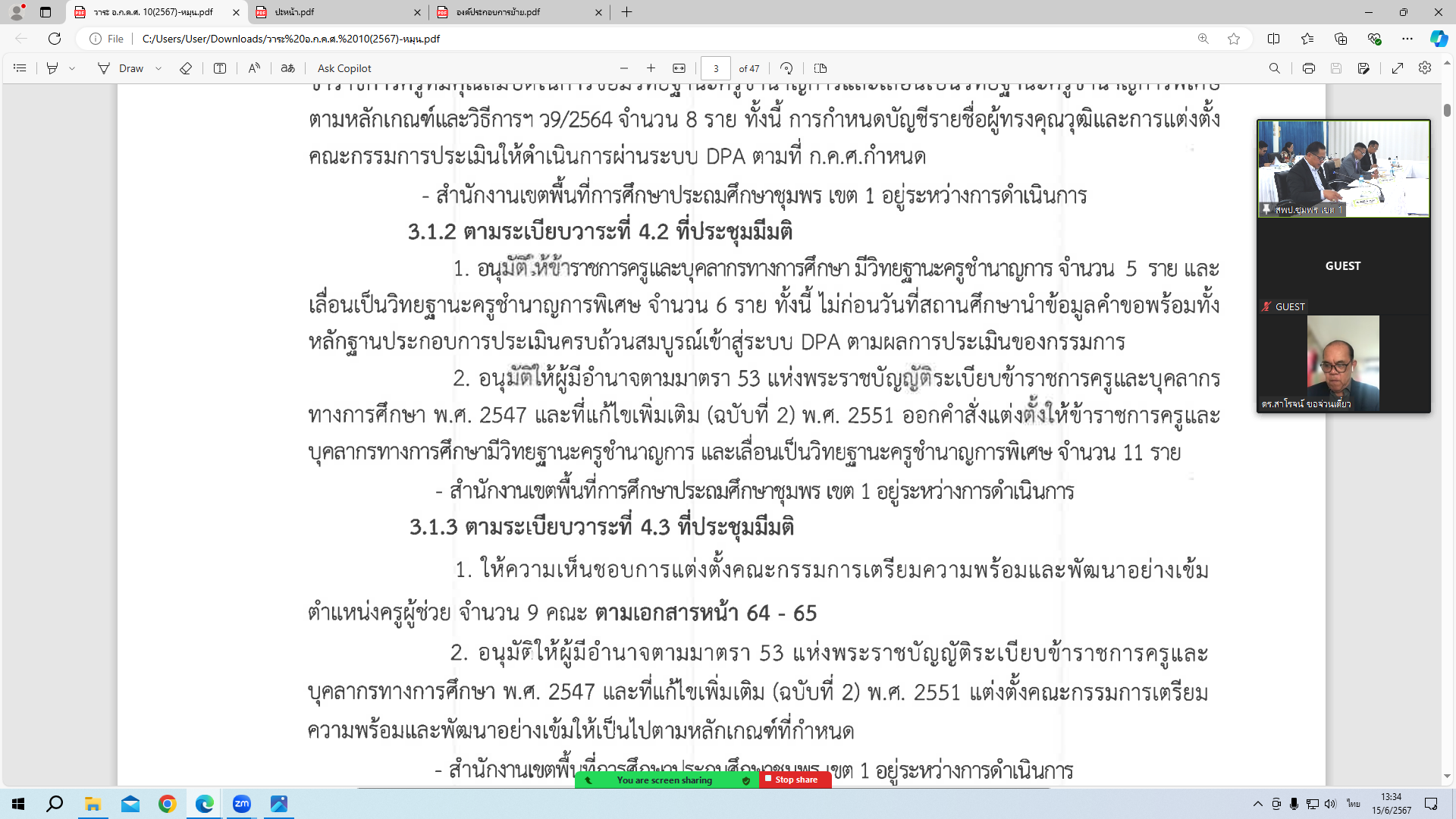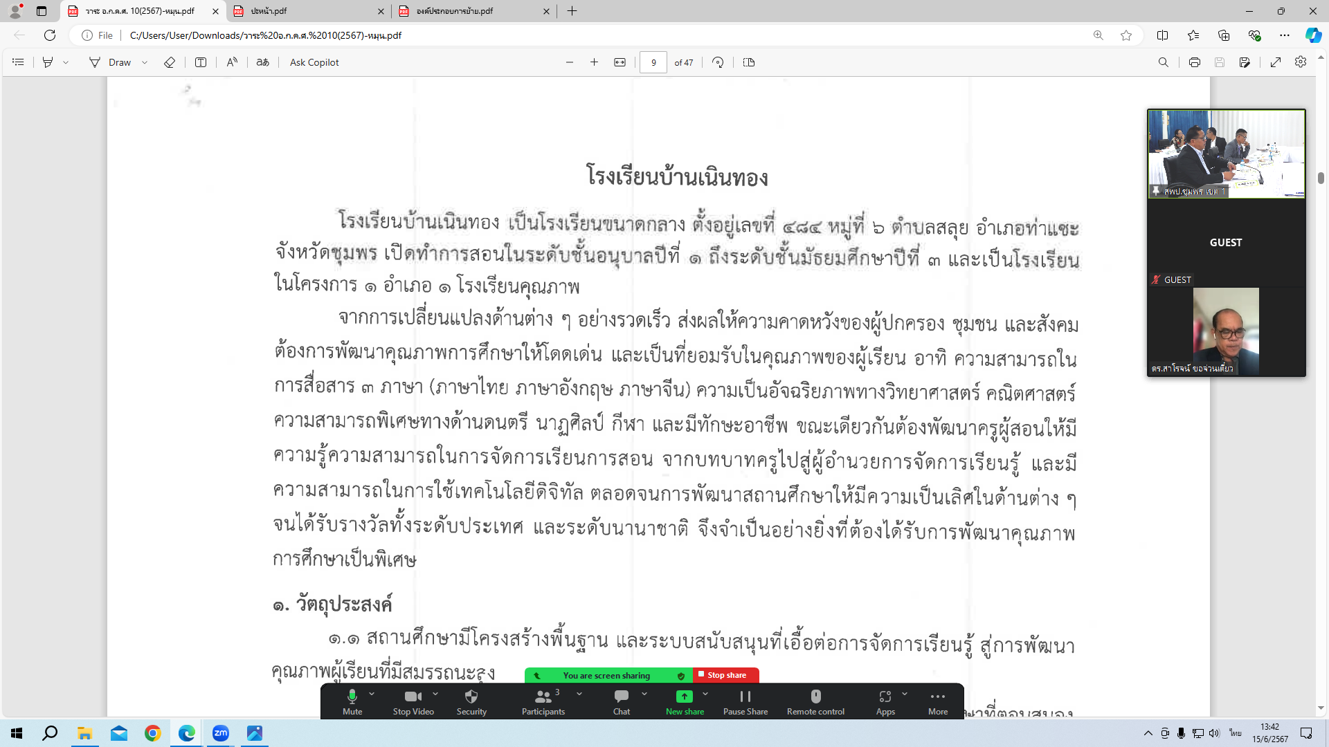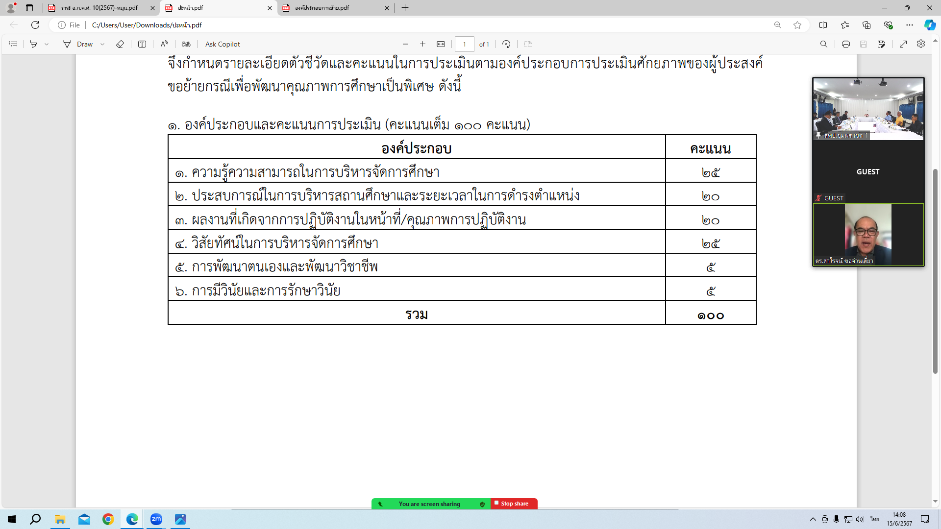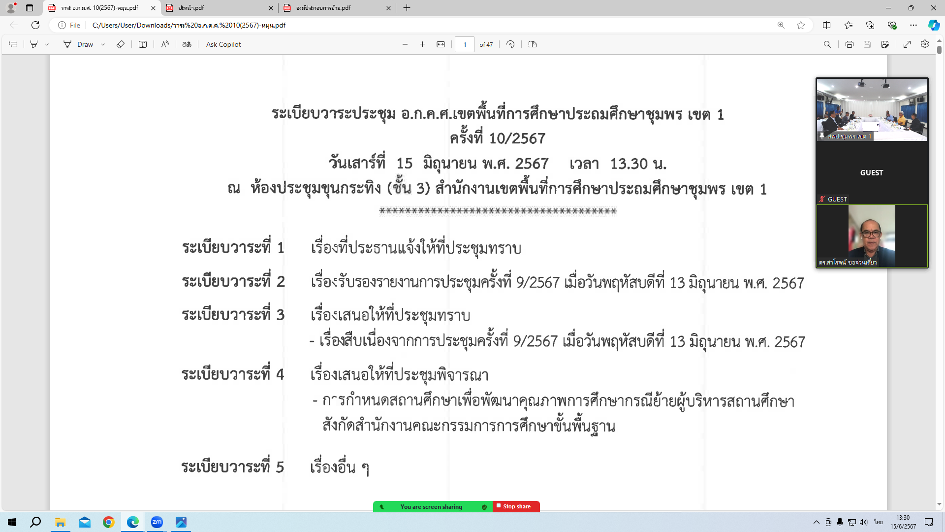 วันที่ 15 มิถุนายน 2567 เวลา 13.30 น. ดร.สาโรจน์ ขอจ่วนเตี๋ยว ประธาน อ.ก.ค.ศ.เป็นประธานการประชุม อ.ก.ค.ศ.เขตพื้นที่การศึกษาประถมศึกษาชุมพร เขต 1 ครั้งที่ 10/2567 ผ่านระบบ Zoom Meeting เพื่อขับเคลื่อนการบริหารงานบุคคลของสำนักงานเขตพื้นที่การศึกษาประถมศึกษาชุมพร เขต 1 อย่างมีประสิทธิภาพ เป็นไปตามระเบียบและหลักเกณฑ์ที่เกี่ยวข้อง โดยมี ดร.ศักดิ์สิทธิ์ แร่ทอง ผู้อำนวยการสำนักงานเขตพื้นที่การศึกษาประถมศึกษาชุมพร เขต 1 อนุกรรมการและเลขานุการ นำเสนอข้อมูลตามระเบียบวาระการประชุม ให้ที่ประชุมทราบ และร่วมกันพิจารณา ณ ห้องประชุมขุนกระทิง (ชั้น 3) สำนักงานเขตพื้นที่การศึกษาประถมศึกษาชุมพร เขต 1