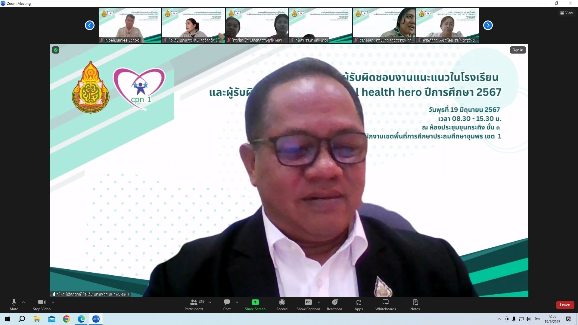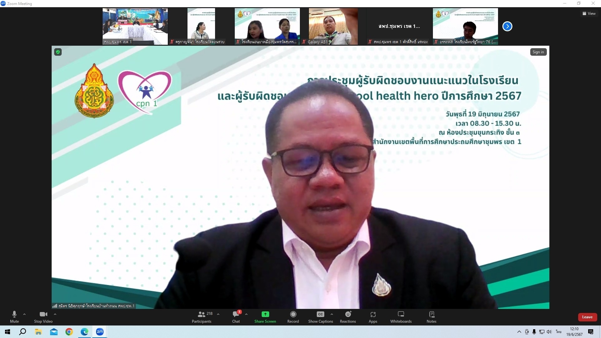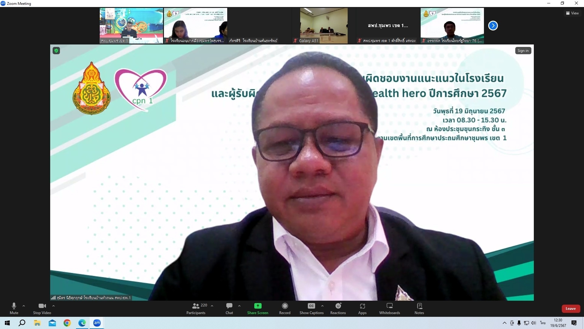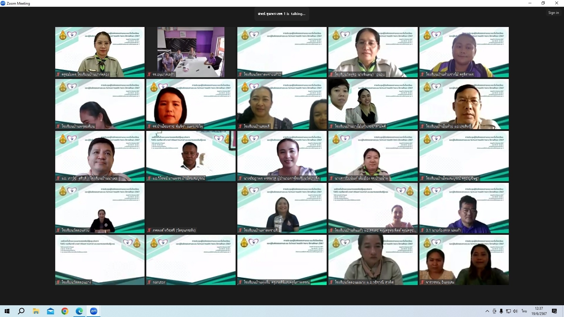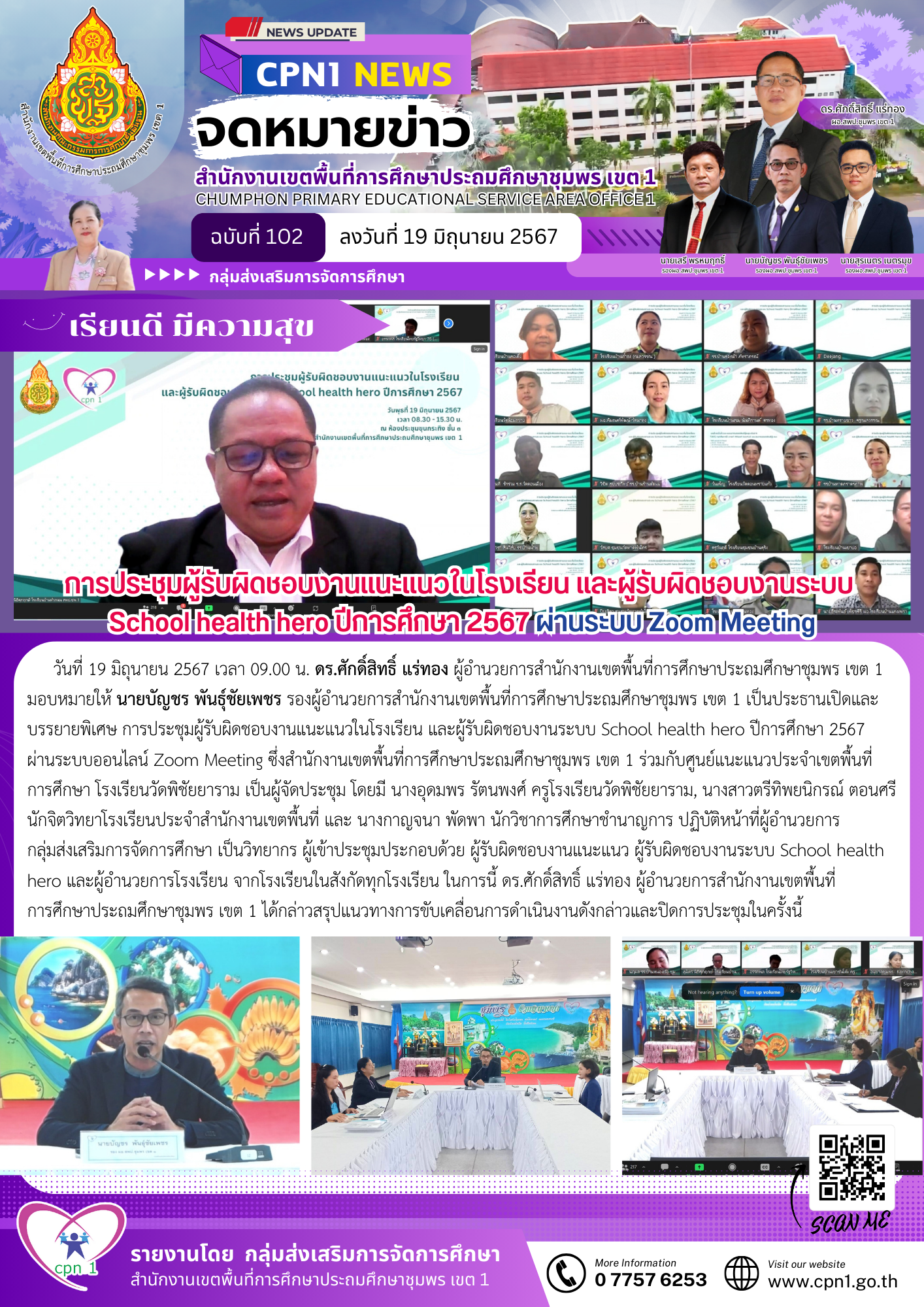 วันที่ 19 มิถุนายน 2567 เวลา 09.00 น. ดร.ศักดิ์สิทธิ์ แร่ทอง ผู้อำนวยการสำนักงานเขตพื้นที่การศึกษาประถมศึกษาชุมพร เขต 1 มอบหมายให้ นายบัญชร พันธุ์ชัยเพชร รองผู้อำนวยการสำนักงานเขตพื้นที่การศึกษาประถมศึกษาชุมพร เขต 1 เป็นประธานเปิดและบรรยายพิเศษ การประชุมผู้รับผิดชอบงานแนะแนวในโรงเรียน และผู้รับผิดชอบงานระบบ School health hero ปีการศึกษา 2567 ผ่านระบบออนไลน์ Zoom Meeting ซึ่งสำนักงานเขตพื้นที่การศึกษาประถมศึกษาชุมพร เขต 1 ร่วมกับศูนย์แนะแนวประจำเขตพื้นที่การศึกษา โรงเรียนวัดพิชัยยาราม เป็นผู้จัดประชุม โดยมี นางอุดมพร รัตนพงศ์ ครูโรงเรียนวัดพิชัยยาราม, นางสาวตรีทิพยนิกรณ์ ตอนศรี นักจิตวิทยาโรงเรียนประจำสำนักงานเขตพื้นที่ และ นางกาญจนา พัดพา นักวิชาการศึกษาชำนาญการ ปฏิบัติหน้าที่ผู้อำนวยการกลุ่มส่งเสริมการจัดการศึกษา เป็นวิทยากร ผู้เข้าประชุมประกอบด้วย ผู้รับผิดชอบงานแนะแนว ผู้รับผิดชอบงานระบบ School health hero และผู้อำนวยการโรงเรียน จากโรงเรียนในสังกัดทุกโรงเรียน ในการนี้ ดร.ศักดิ์สิทธิ์ แร่ทอง ผู้อำนวยการสำนักงานเขตพื้นที่การศึกษาประถมศึกษาชุมพร เขต 1 ได้กล่าวสรุปแนวทางการขับเคลื่อนการดำเนินงานดังกล่าวและปิดการประชุมในครั้งนี้