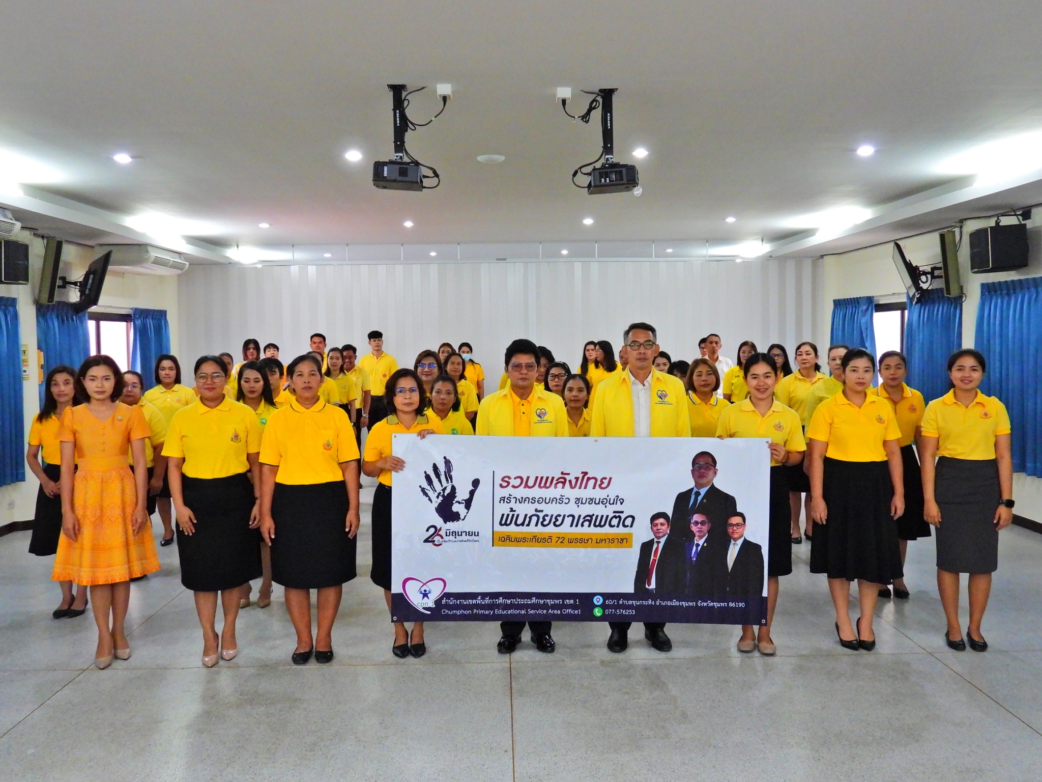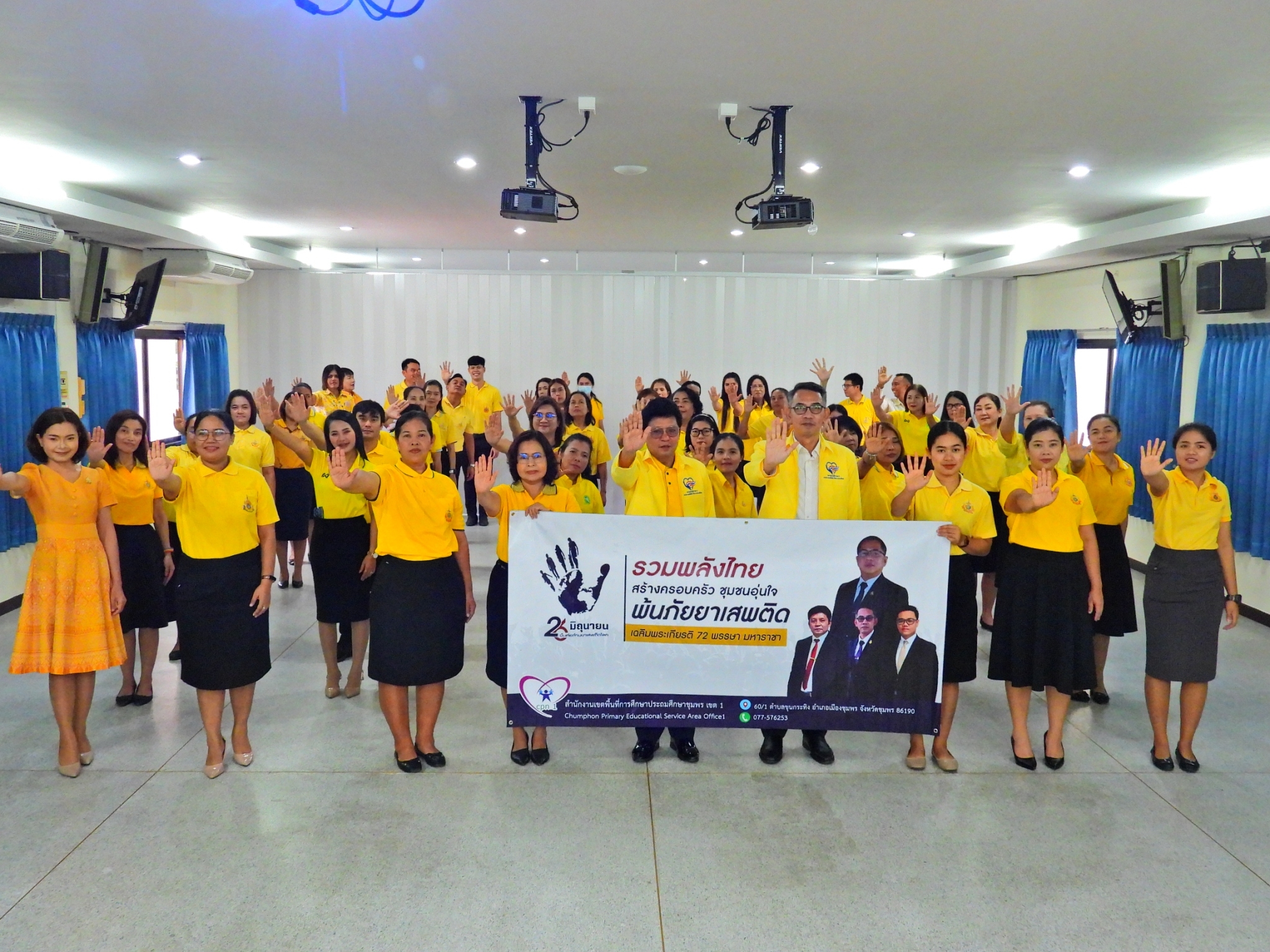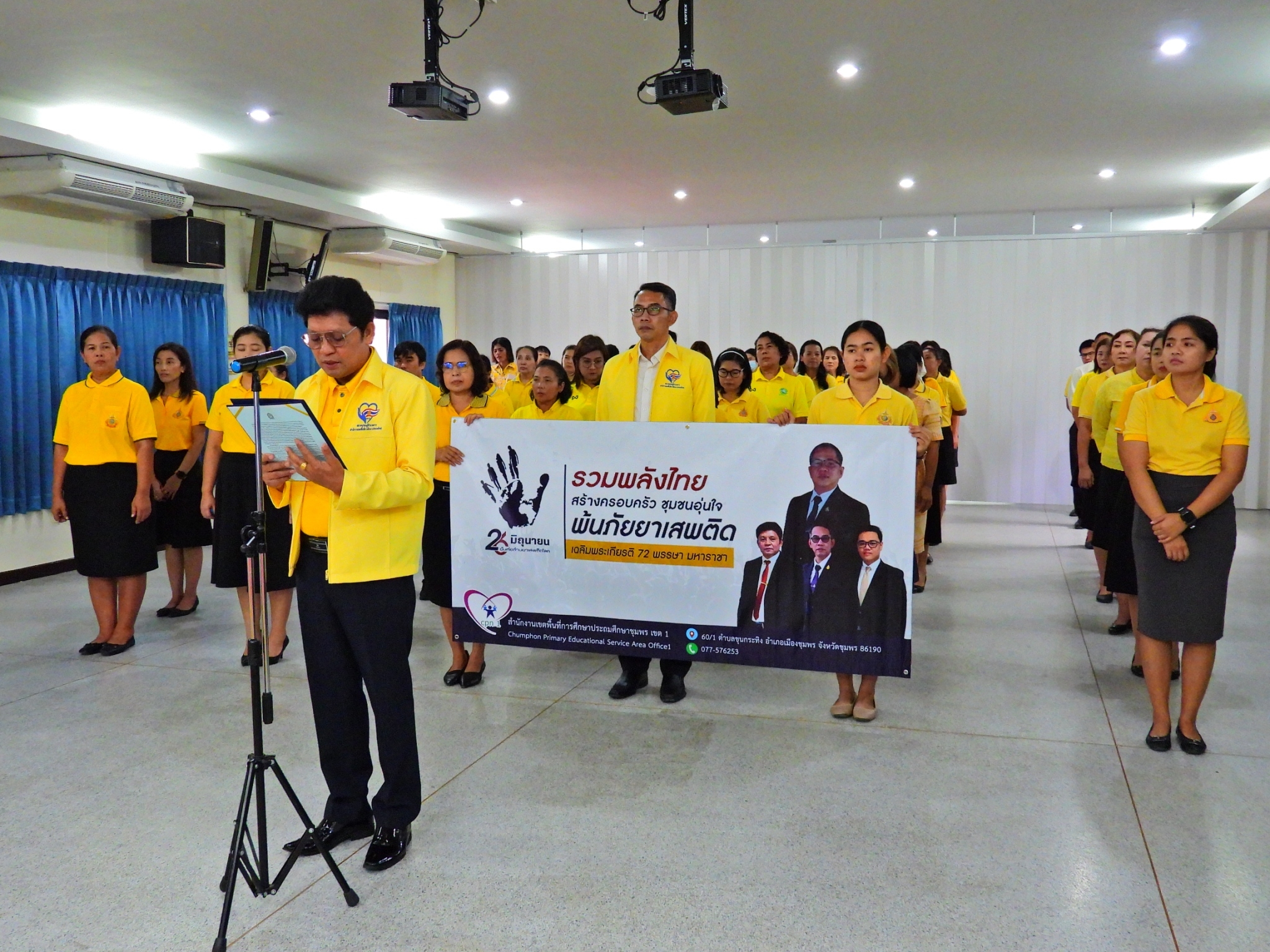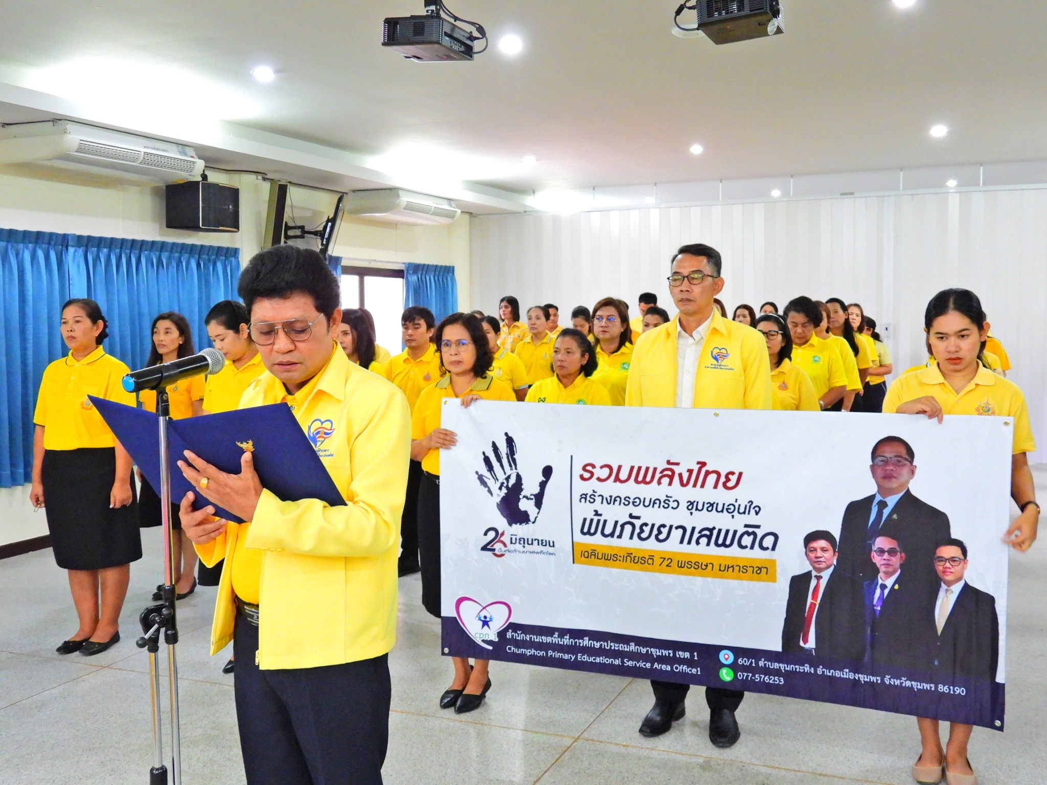 >>> วันที่ 26 มิถุนายน 2567 เวลา 09.00 น. ดร.ศักดิ์สิทธิ์ แร่ทอง ผู้อำนวยการสำนักงานเขตพื้นที่การศึกษาประถมศึกษาชุมพร เขต 1 มอบหมายให้ นายเสรี พรหมฤทธิ์ รองผู้อำนวยการสำนักงานเขตพื้นที่การศึกษาประถมศึกษาชุมพร เขต 1 เป็นประธานในพิธีการจัดกิจกรรม "รวมพลังไทย สร้างครอบครัว ชุมชนอุ่นใจ พ้นภัยยาเสพติด เฉลิมพระเกียรติ 72 พรรษา มหาราชา" เนื่องในวันต่อต้านยาเสพติดโลก (26 มิถุนายน) ประจำปี 2567 พร้อมด้วย นายบัญชร พันธุ์ชัยเพชร รองผู้อำนวยการสำนักงานเขตพื้นที่การศึกษาประถมศึกษาชุมพร เขต 1 ข้าราชการครูและบุคลากรทางการศึกษา และเจ้าหน้าที่ในสำนักงานเขตพื้นที่การศึกษาประถมศึกษาชุมพร เขต 1 ทุกท่านร่วมกิจกรรม การแต่งกายด้วยการสวมเสื้อสีเหลือง เพื่อเฉลิมพระเกียรติพระบาทสมเด็จพระเจ้าอยู่หัว เนื่องในโอกาสมหามงคลเฉลิมพระชนมพรรษา 6 รอบ 28 กรกฎาคม 2567 ในวันพุธที่ 26 มิถุนายน 2567 โดยการอ่านสารของรัฐมนตรีว่าการกระทรวงศึกษาธิการ และกล่าวคำปฏิญาณตนประกาศเจตนารมณ์ต่อต้านยาเสพติด ณ ห้องประชุมขุนกระทิง ชั้น 3 สำนักงานเขตพื้นที่การศึกษาประถมศึกษาชุมพร เขต 1