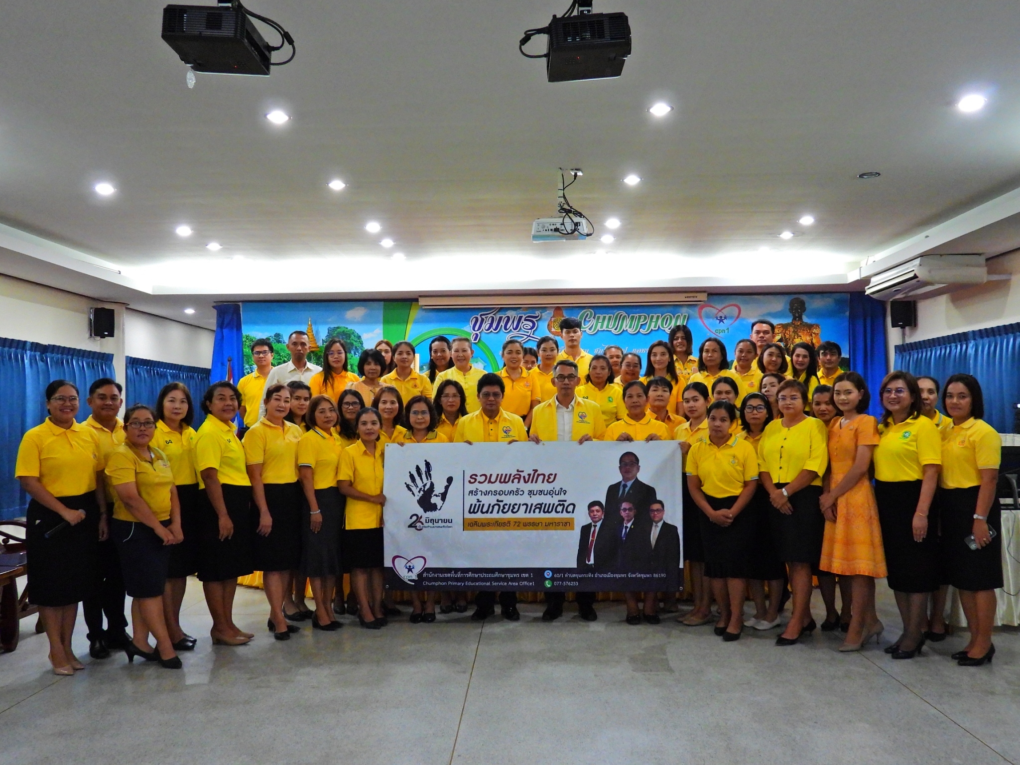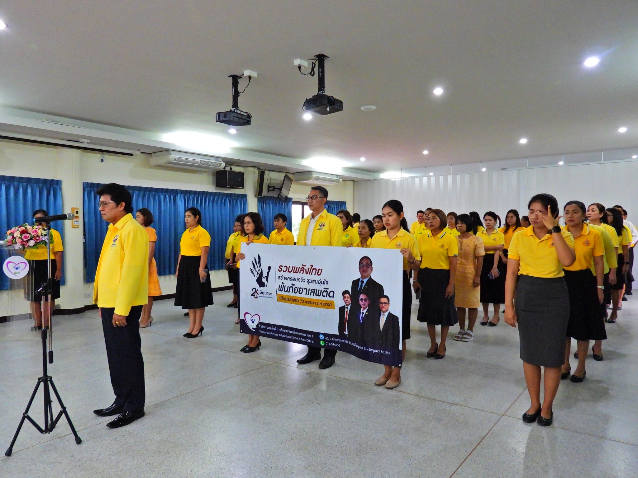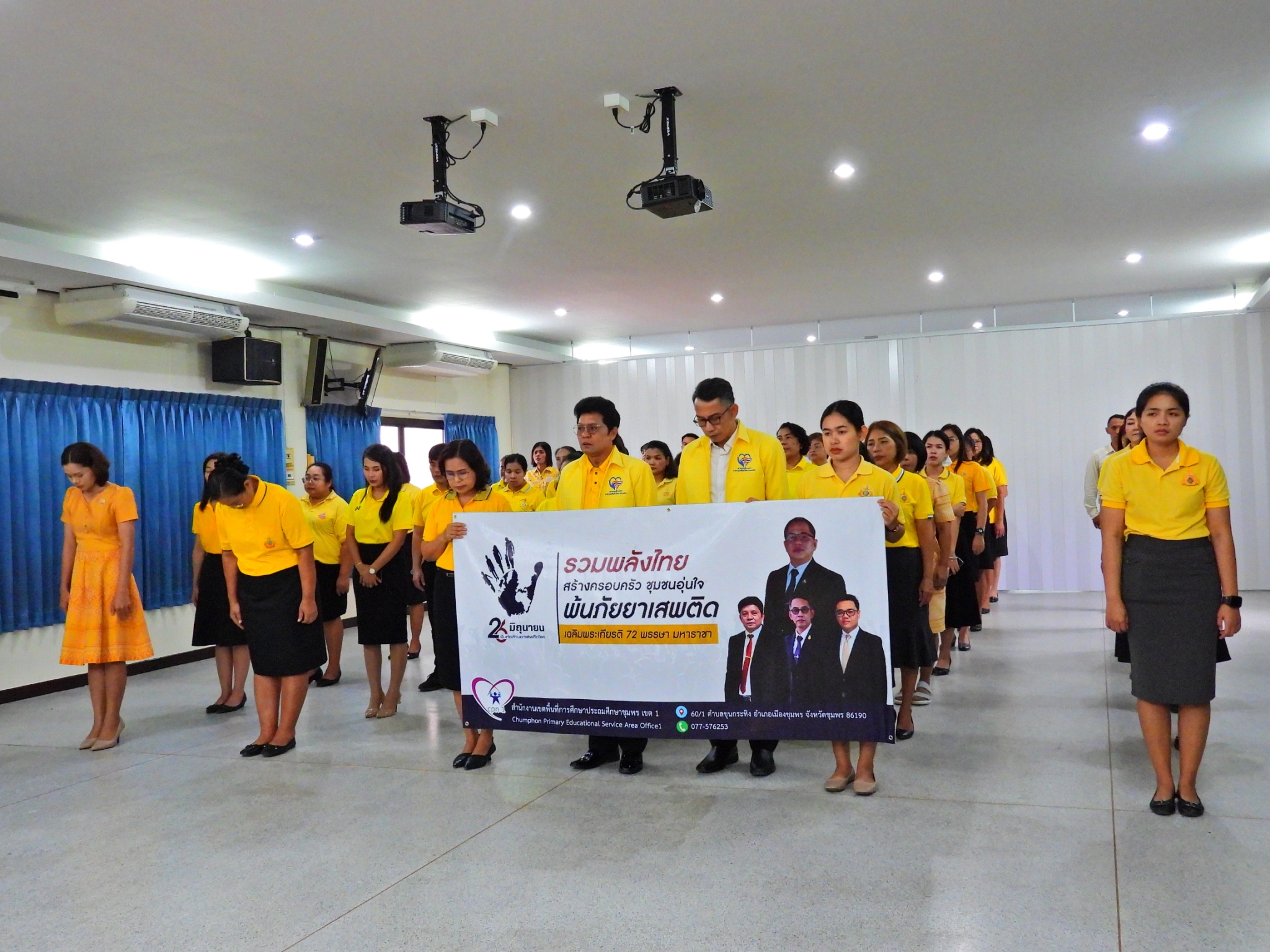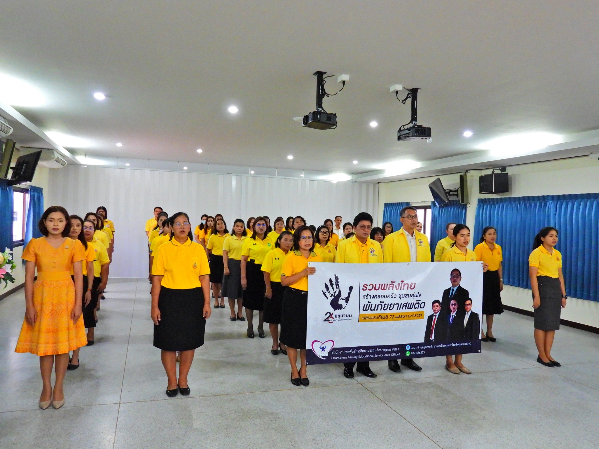 >>> วันที่ 26 มิถุนายน 2567 เวลา 09.00 น. ดร.ศักดิ์สิทธิ์ แร่ทอง ผู้อำนวยการสำนักงานเขตพื้นที่การศึกษาประถมศึกษาชุมพร เขต 1 มอบหมายให้ นายเสรี พรหมฤทธิ์ รองผู้อำนวยการสำนักงานเขตพื้นที่การศึกษาประถมศึกษาชุมพร เขต 1 เป็นประธานในพิธีการจัดกิจกรรม "รวมพลังไทย สร้างครอบครัว ชุมชนอุ่นใจ พ้นภัยยาเสพติด เฉลิมพระเกียรติ 72 พรรษา มหาราชา" เนื่องในวันต่อต้านยาเสพติดโลก (26 มิถุนายน) ประจำปี 2567 พร้อมด้วย นายบัญชร พันธุ์ชัยเพชร รองผู้อำนวยการสำนักงานเขตพื้นที่การศึกษาประถมศึกษาชุมพร เขต 1 ข้าราชการครูและบุคลากรทางการศึกษา และเจ้าหน้าที่ในสำนักงานเขตพื้นที่การศึกษาประถมศึกษาชุมพร เขต 1 ทุกท่านร่วมกิจกรรม การแต่งกายด้วยการสวมเสื้อสีเหลือง เพื่อเฉลิมพระเกียรติพระบาทสมเด็จพระเจ้าอยู่หัว เนื่องในโอกาสมหามงคลเฉลิมพระชนมพรรษา 6 รอบ 28 กรกฎาคม 2567 ในวันพุธที่ 26 มิถุนายน 2567 โดยการอ่านสารของรัฐมนตรีว่าการกระทรวงศึกษาธิการ และกล่าวคำปฏิญาณตนประกาศเจตนารมณ์ต่อต้านยาเสพติด ณ ห้องประชุมขุนกระทิง ชั้น 3 สำนักงานเขตพื้นที่การศึกษาประถมศึกษาชุมพร เขต 1