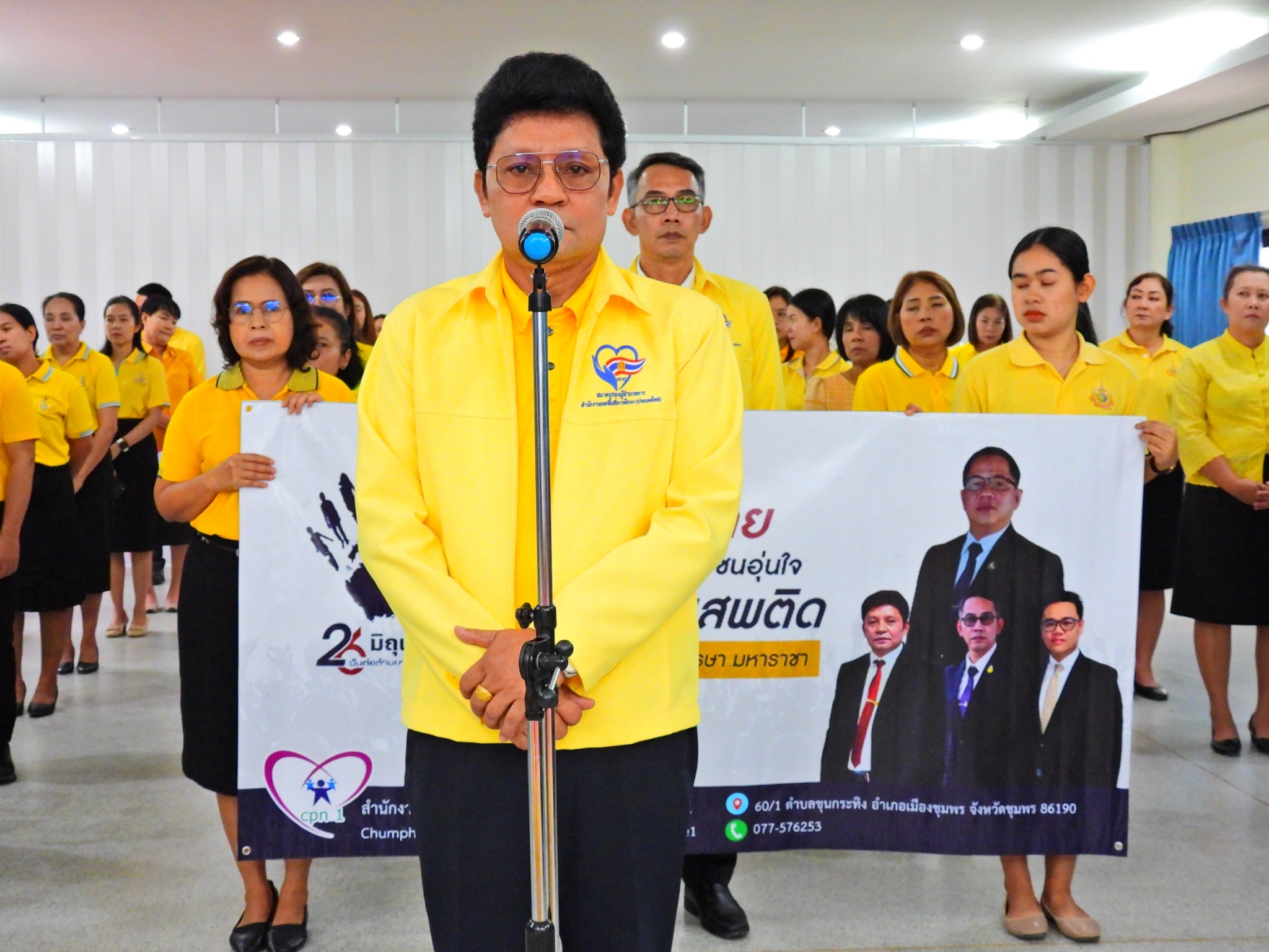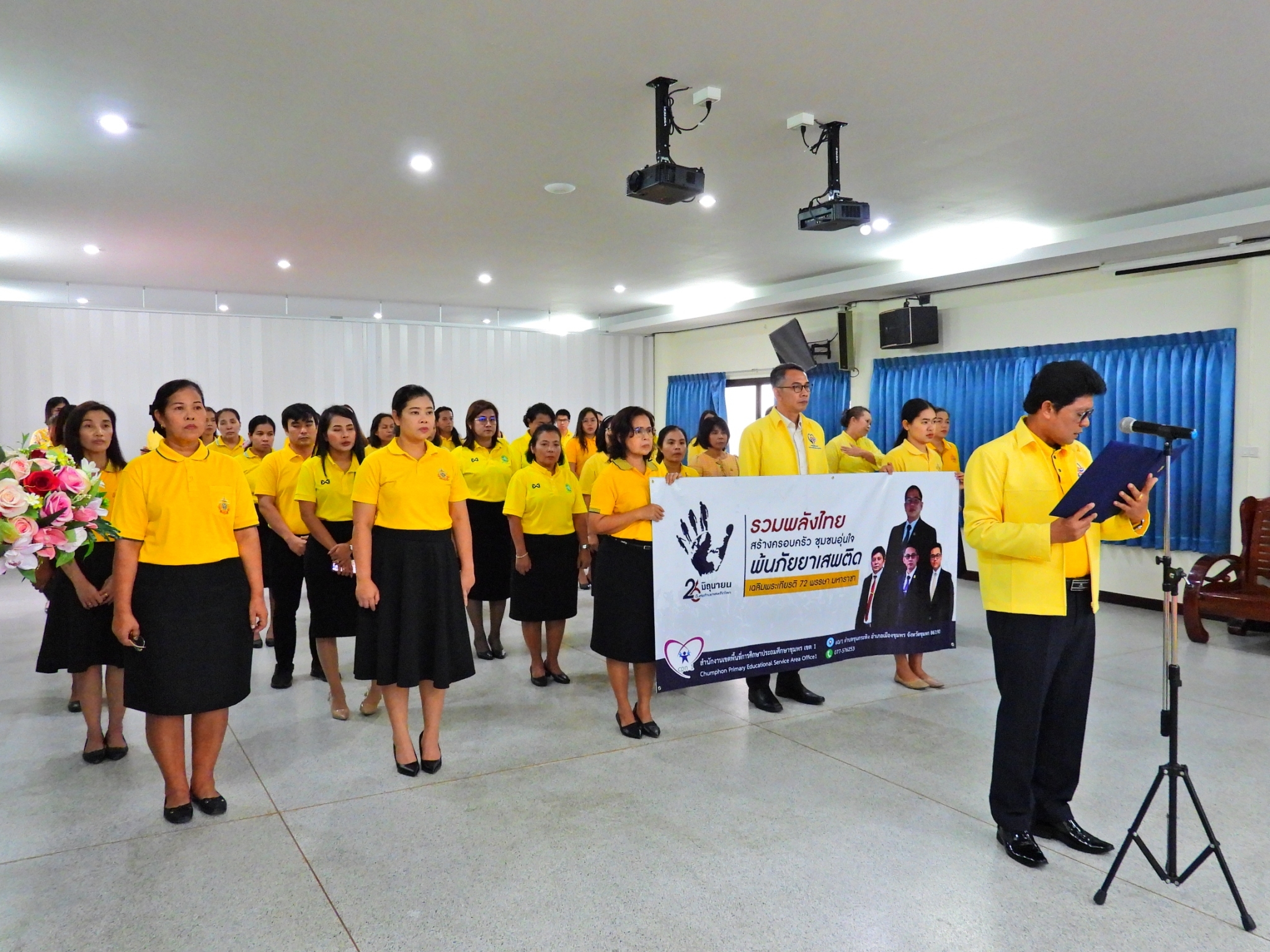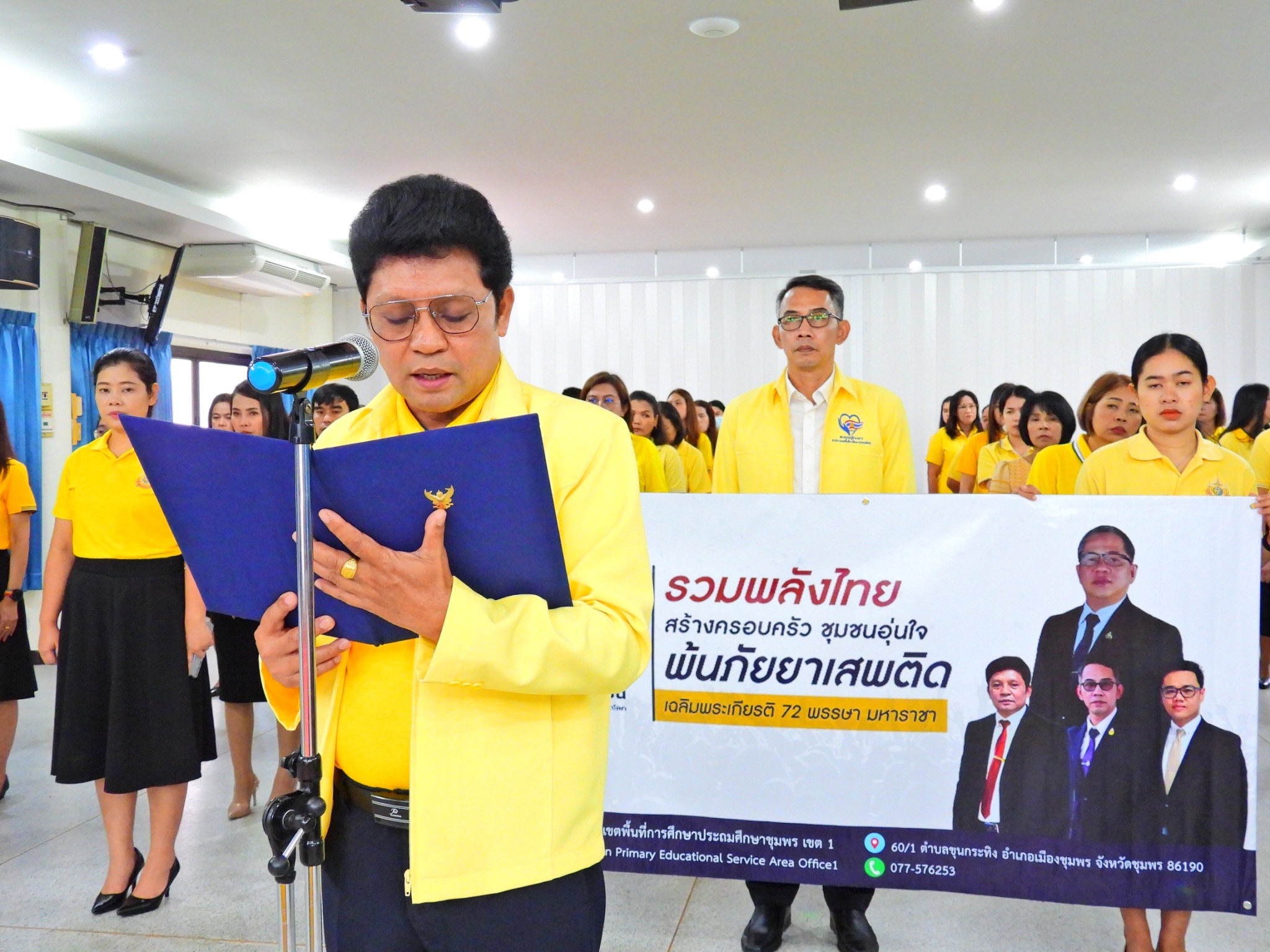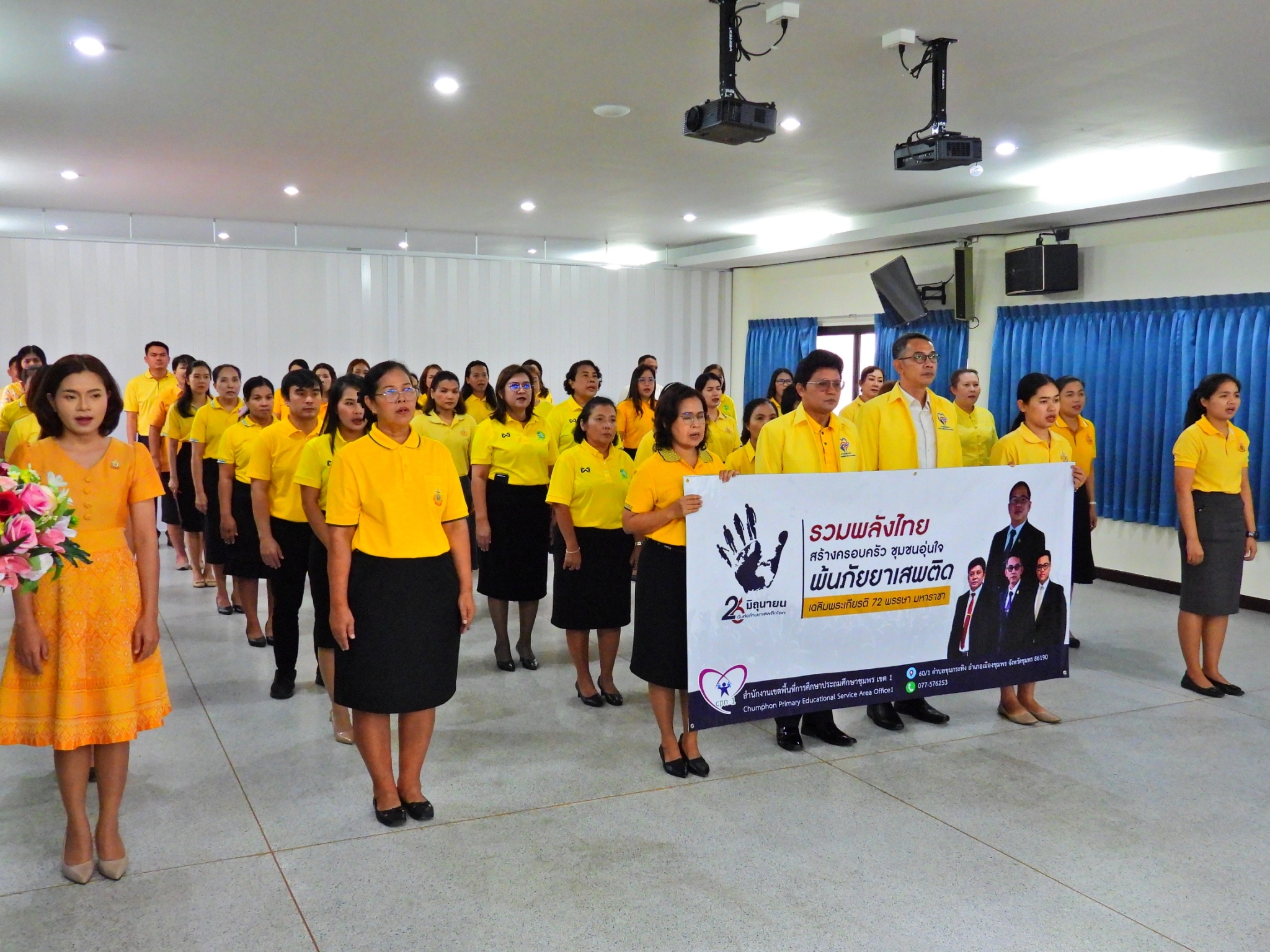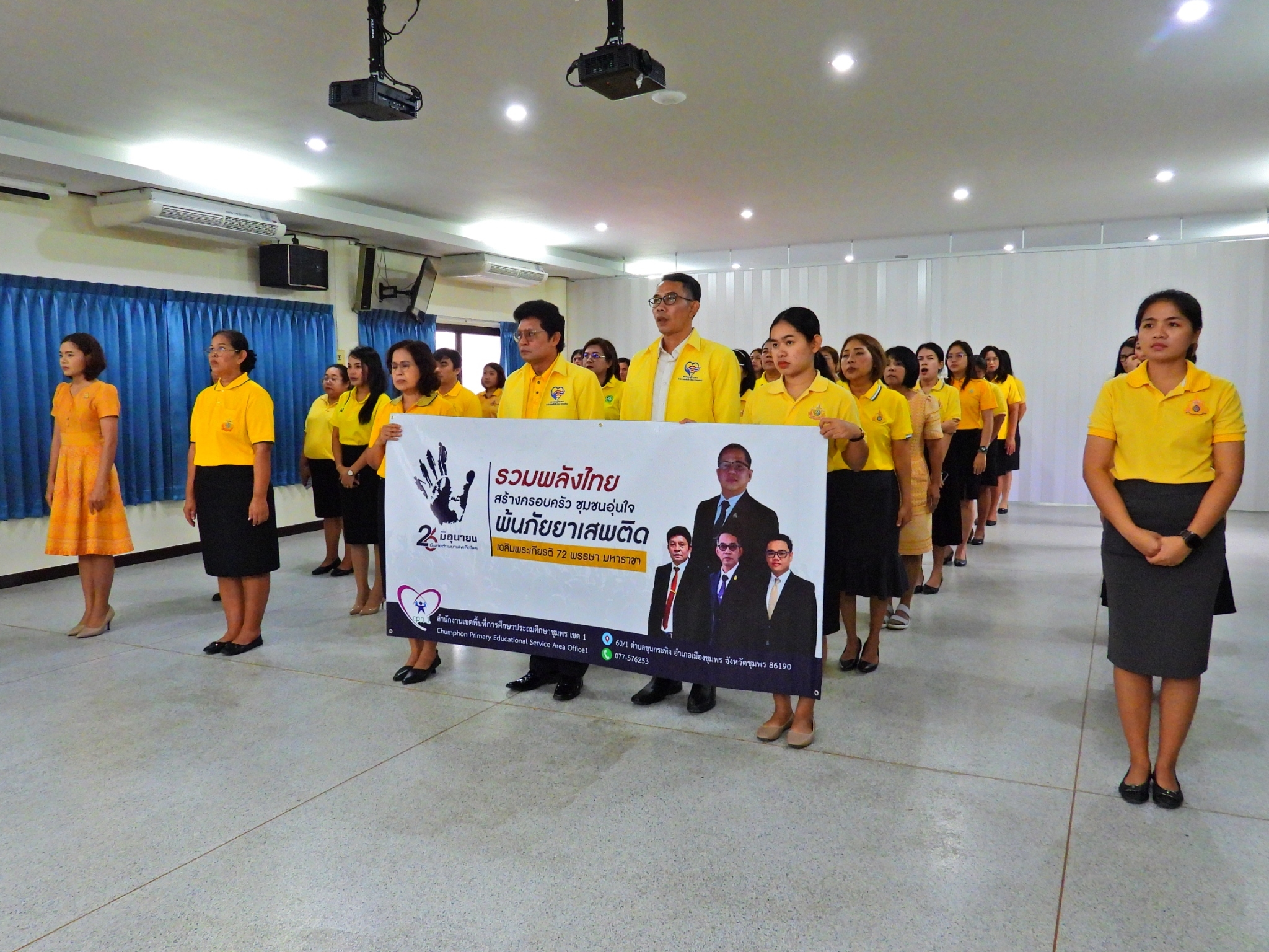 >>> วันที่ 26 มิถุนายน 2567 เวลา 09.00 น. ดร.ศักดิ์สิทธิ์ แร่ทอง ผู้อำนวยการสำนักงานเขตพื้นที่การศึกษาประถมศึกษาชุมพร เขต 1 มอบหมายให้ นายเสรี พรหมฤทธิ์ รองผู้อำนวยการสำนักงานเขตพื้นที่การศึกษาประถมศึกษาชุมพร เขต 1 เป็นประธานในพิธีการจัดกิจกรรม "รวมพลังไทย สร้างครอบครัว ชุมชนอุ่นใจ พ้นภัยยาเสพติด เฉลิมพระเกียรติ 72 พรรษา มหาราชา" เนื่องในวันต่อต้านยาเสพติดโลก (26 มิถุนายน) ประจำปี 2567 พร้อมด้วย นายบัญชร พันธุ์ชัยเพชร รองผู้อำนวยการสำนักงานเขตพื้นที่การศึกษาประถมศึกษาชุมพร เขต 1 ข้าราชการครูและบุคลากรทางการศึกษา และเจ้าหน้าที่ในสำนักงานเขตพื้นที่การศึกษาประถมศึกษาชุมพร เขต 1 ทุกท่านร่วมกิจกรรม การแต่งกายด้วยการสวมเสื้อสีเหลือง เพื่อเฉลิมพระเกียรติพระบาทสมเด็จพระเจ้าอยู่หัว เนื่องในโอกาสมหามงคลเฉลิมพระชนมพรรษา 6 รอบ 28 กรกฎาคม 2567 ในวันพุธที่ 26 มิถุนายน 2567 โดยการอ่านสารของรัฐมนตรีว่าการกระทรวงศึกษาธิการ และกล่าวคำปฏิญาณตนประกาศเจตนารมณ์ต่อต้านยาเสพติด ณ ห้องประชุมขุนกระทิง ชั้น 3 สำนักงานเขตพื้นที่การศึกษาประถมศึกษาชุมพร เขต 1