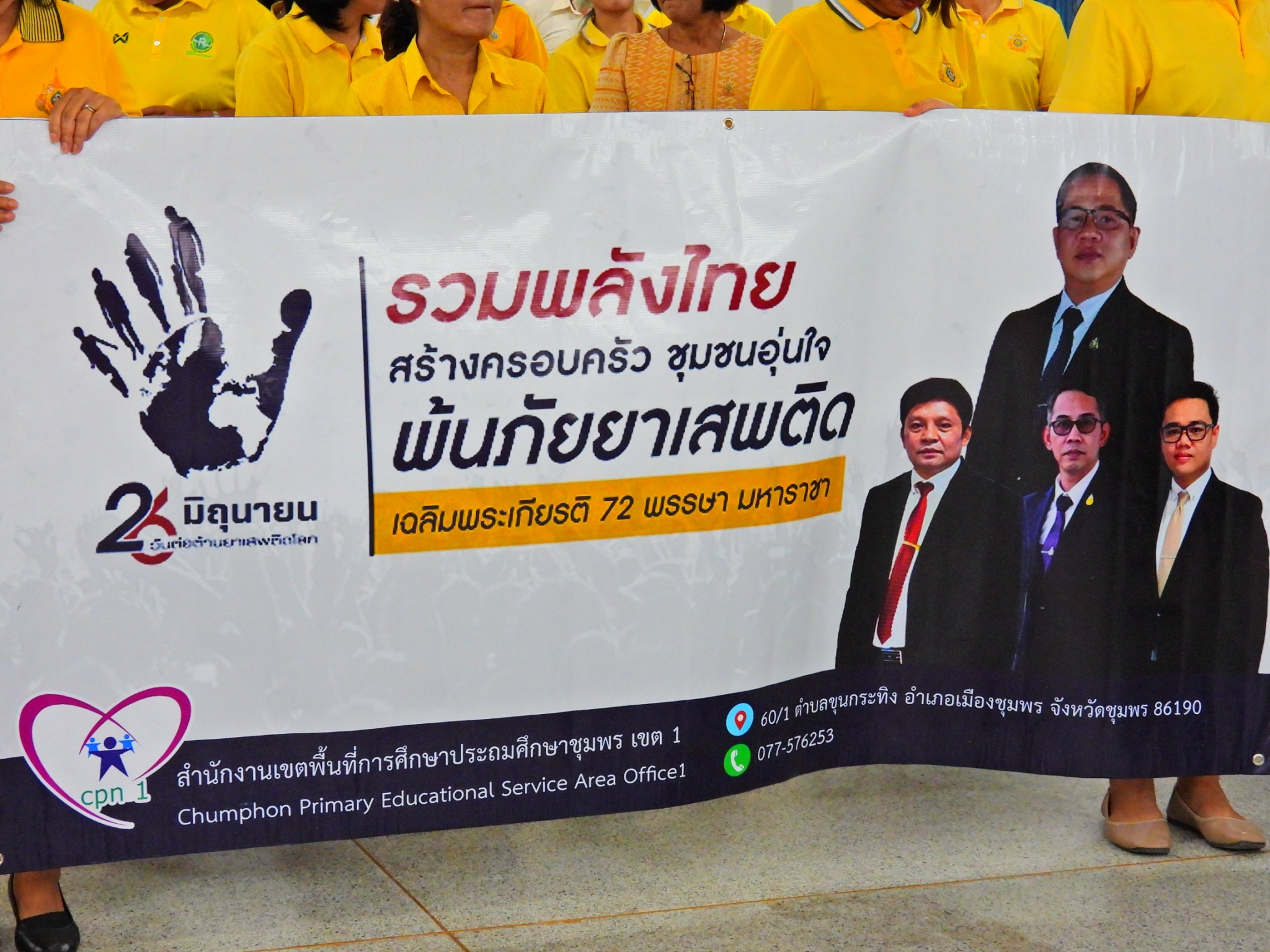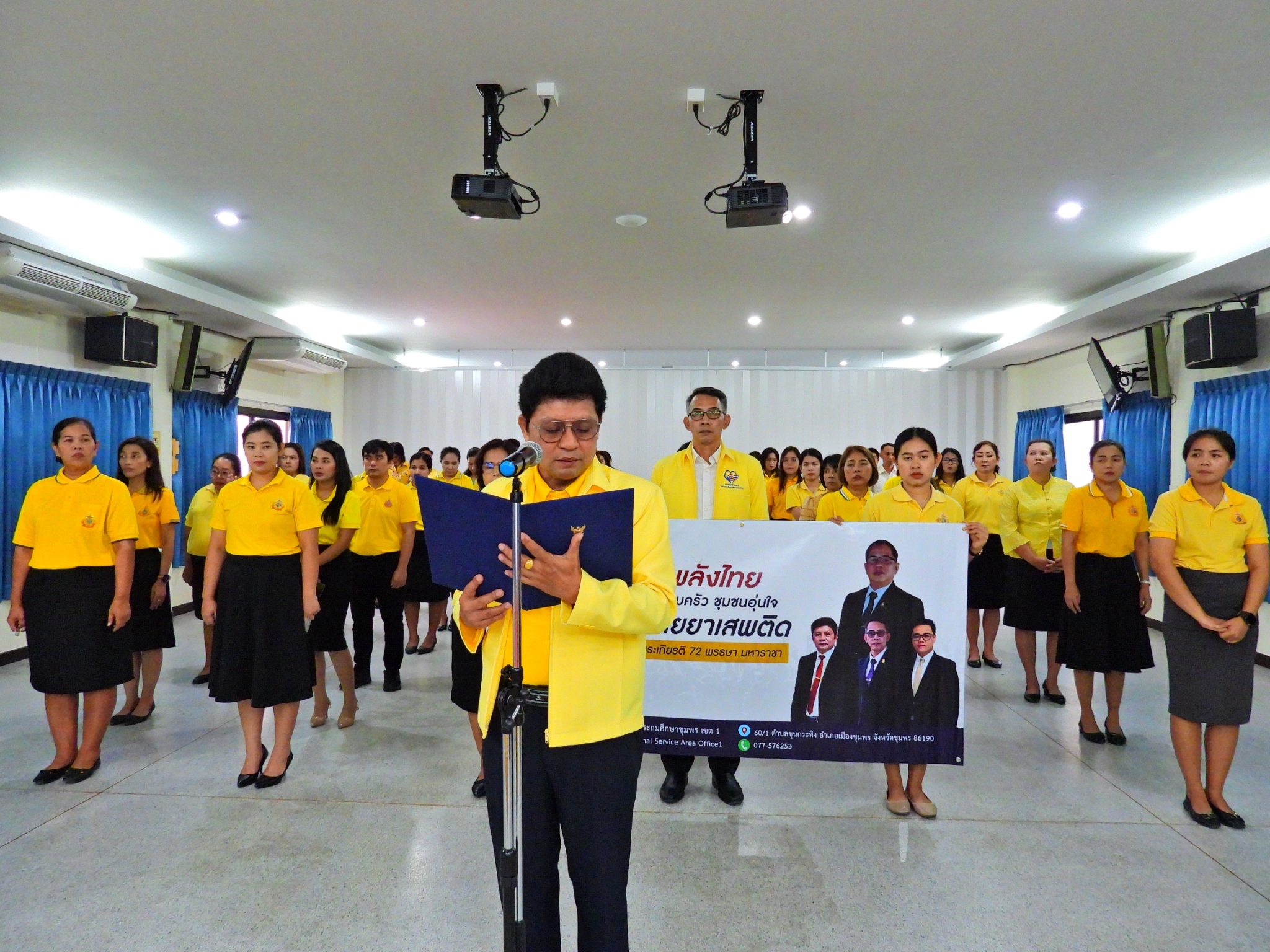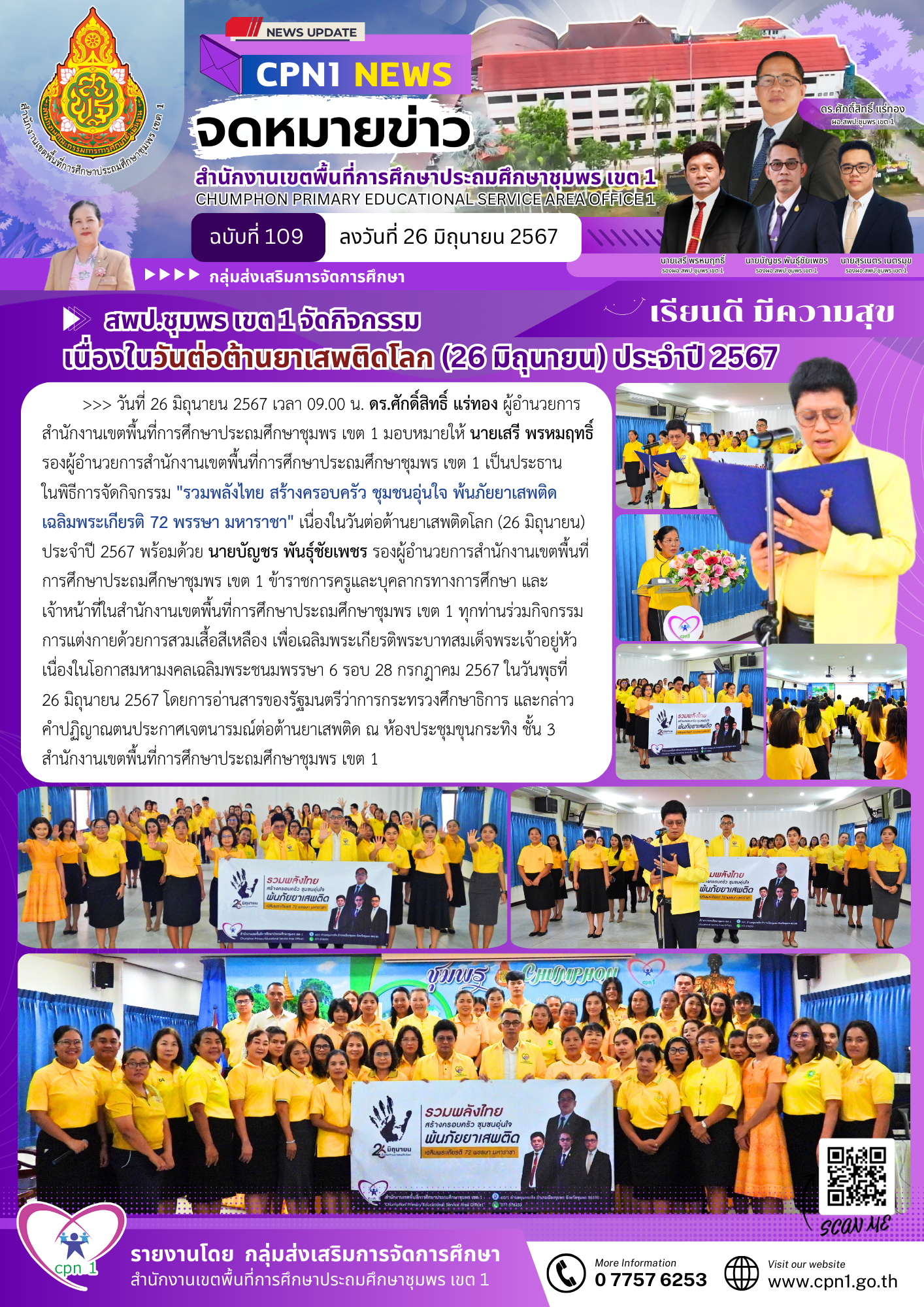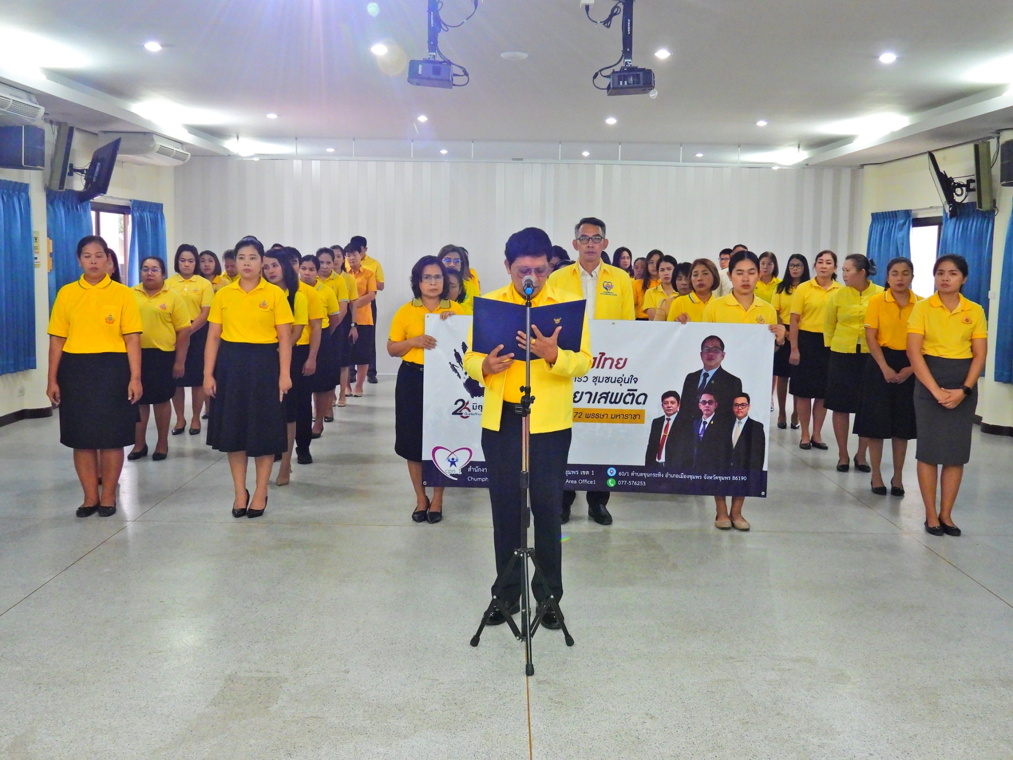 >>> วันที่ 26 มิถุนายน 2567 เวลา 09.00 น. ดร.ศักดิ์สิทธิ์ แร่ทอง ผู้อำนวยการสำนักงานเขตพื้นที่การศึกษาประถมศึกษาชุมพร เขต 1 มอบหมายให้ นายเสรี พรหมฤทธิ์ รองผู้อำนวยการสำนักงานเขตพื้นที่การศึกษาประถมศึกษาชุมพร เขต 1 เป็นประธานในพิธีการจัดกิจกรรม "รวมพลังไทย สร้างครอบครัว ชุมชนอุ่นใจ พ้นภัยยาเสพติด เฉลิมพระเกียรติ 72 พรรษา มหาราชา" เนื่องในวันต่อต้านยาเสพติดโลก (26 มิถุนายน) ประจำปี 2567 พร้อมด้วย นายบัญชร พันธุ์ชัยเพชร รองผู้อำนวยการสำนักงานเขตพื้นที่การศึกษาประถมศึกษาชุมพร เขต 1 ข้าราชการครูและบุคลากรทางการศึกษา และเจ้าหน้าที่ในสำนักงานเขตพื้นที่การศึกษาประถมศึกษาชุมพร เขต 1 ทุกท่านร่วมกิจกรรม การแต่งกายด้วยการสวมเสื้อสีเหลือง เพื่อเฉลิมพระเกียรติพระบาทสมเด็จพระเจ้าอยู่หัว เนื่องในโอกาสมหามงคลเฉลิมพระชนมพรรษา 6 รอบ 28 กรกฎาคม 2567 ในวันพุธที่ 26 มิถุนายน 2567 โดยการอ่านสารของรัฐมนตรีว่าการกระทรวงศึกษาธิการ และกล่าวคำปฏิญาณตนประกาศเจตนารมณ์ต่อต้านยาเสพติด ณ ห้องประชุมขุนกระทิง ชั้น 3 สำนักงานเขตพื้นที่การศึกษาประถมศึกษาชุมพร เขต 1