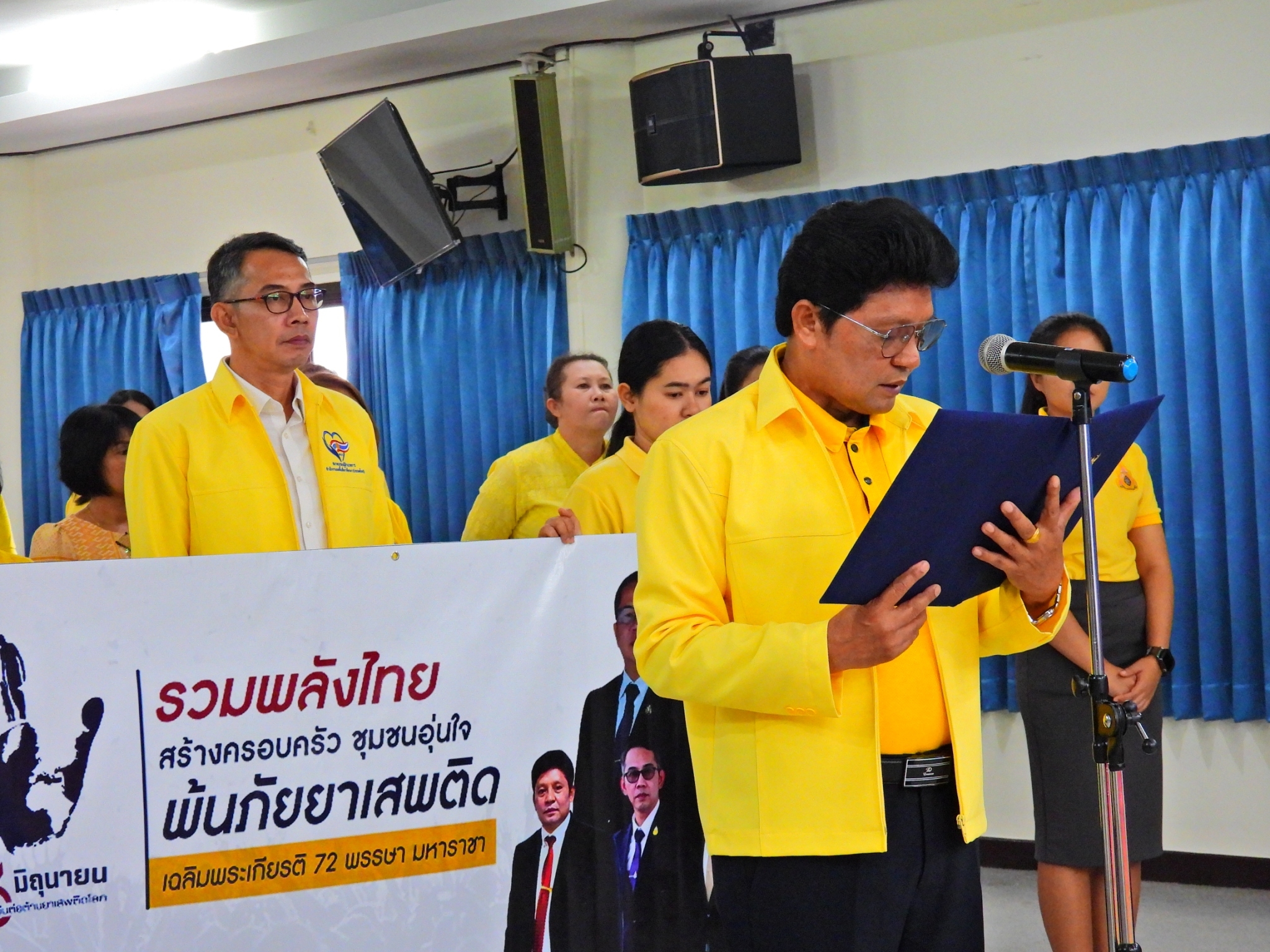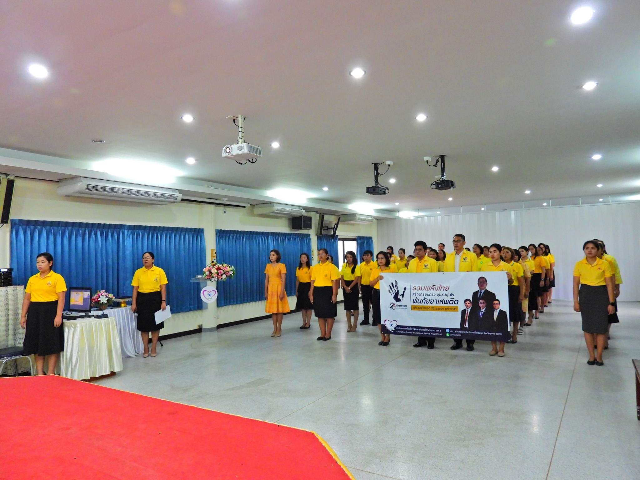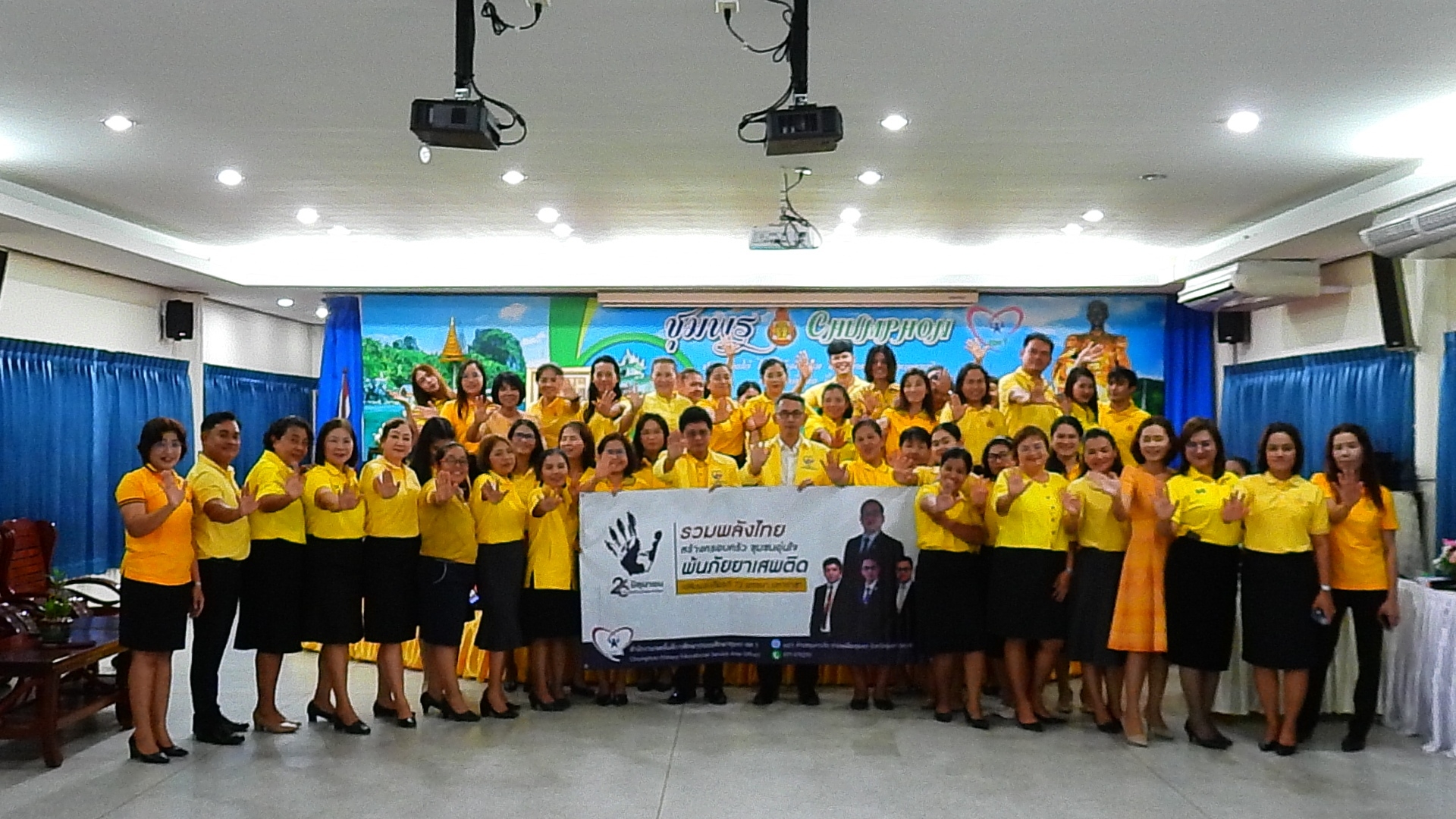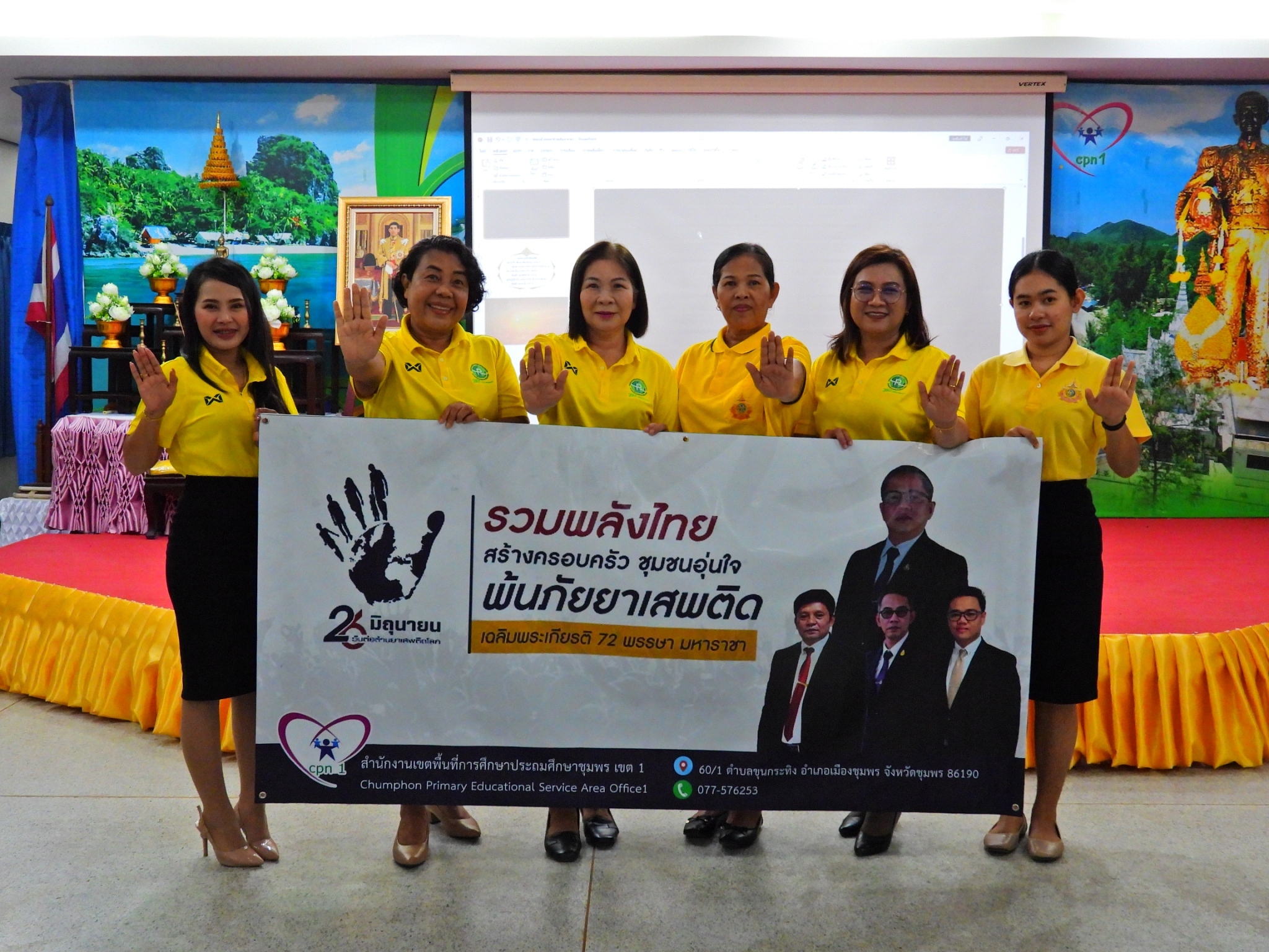 >>> วันที่ 26 มิถุนายน 2567 เวลา 09.00 น. ดร.ศักดิ์สิทธิ์ แร่ทอง ผู้อำนวยการสำนักงานเขตพื้นที่การศึกษาประถมศึกษาชุมพร เขต 1 มอบหมายให้ นายเสรี พรหมฤทธิ์ รองผู้อำนวยการสำนักงานเขตพื้นที่การศึกษาประถมศึกษาชุมพร เขต 1 เป็นประธานในพิธีการจัดกิจกรรม "รวมพลังไทย สร้างครอบครัว ชุมชนอุ่นใจ พ้นภัยยาเสพติด เฉลิมพระเกียรติ 72 พรรษา มหาราชา" เนื่องในวันต่อต้านยาเสพติดโลก (26 มิถุนายน) ประจำปี 2567 พร้อมด้วย นายบัญชร พันธุ์ชัยเพชร รองผู้อำนวยการสำนักงานเขตพื้นที่การศึกษาประถมศึกษาชุมพร เขต 1 ข้าราชการครูและบุคลากรทางการศึกษา และเจ้าหน้าที่ในสำนักงานเขตพื้นที่การศึกษาประถมศึกษาชุมพร เขต 1 ทุกท่านร่วมกิจกรรม การแต่งกายด้วยการสวมเสื้อสีเหลือง เพื่อเฉลิมพระเกียรติพระบาทสมเด็จพระเจ้าอยู่หัว เนื่องในโอกาสมหามงคลเฉลิมพระชนมพรรษา 6 รอบ 28 กรกฎาคม 2567 ในวันพุธที่ 26 มิถุนายน 2567 โดยการอ่านสารของรัฐมนตรีว่าการกระทรวงศึกษาธิการ และกล่าวคำปฏิญาณตนประกาศเจตนารมณ์ต่อต้านยาเสพติด ณ ห้องประชุมขุนกระทิง ชั้น 3 สำนักงานเขตพื้นที่การศึกษาประถมศึกษาชุมพร เขต 1