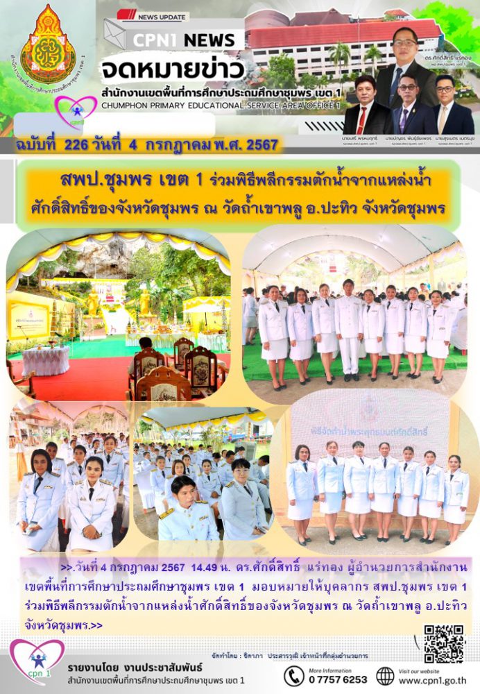 >>.วันที่ 4 กรกฎาคม 2567 14.49 น. ดร.ศักดิ์สิทธิ์ แร่ทอง ผู้อำนวยการสำนักงานเขตพื้นที่การศึกษาประถมศึกษาชุมพร เขต 1 มอบหมายให้บุคลากร สพป.ชุมพร เขต 1 ร่วมพิธีพลีกรรมตักน้ำจากแหล่งน้ำศักดิ์สิทธิ์ของจังหวัดชุมพร ณ วัดถ้ำเขาพลู อ.ปะทิว จังหวัดชุมพร.>>