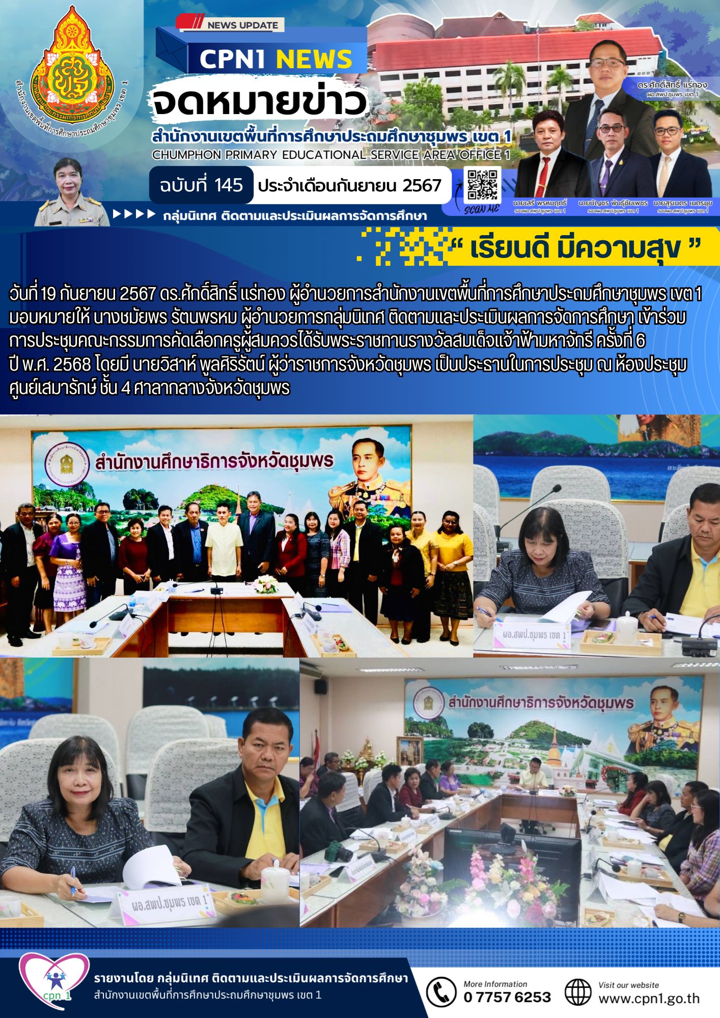 วันที่ 19 กันยายน 2567 ดร.ศักดิ์สิทธิ์ แร่ทอง ผู้อำนวยการสำนักงานเขตพื้นที่การศึกษาประถมศึกษาชุมพร เขต 1