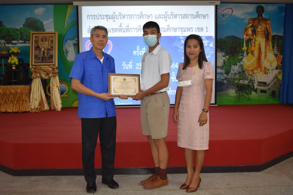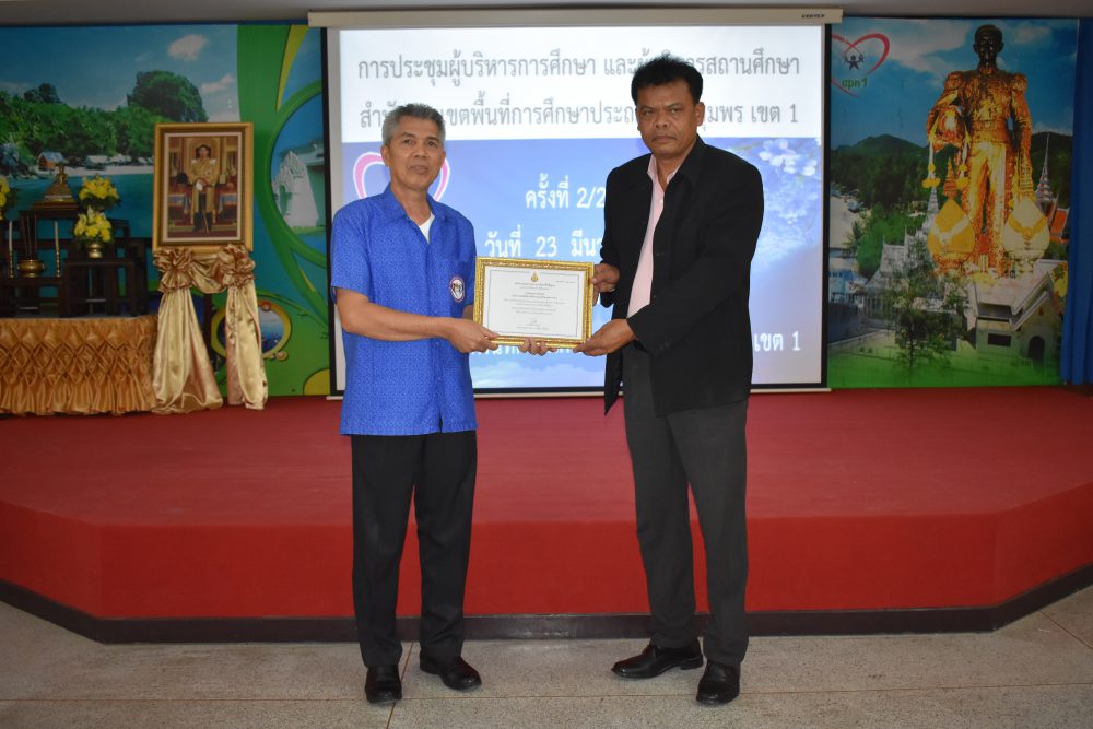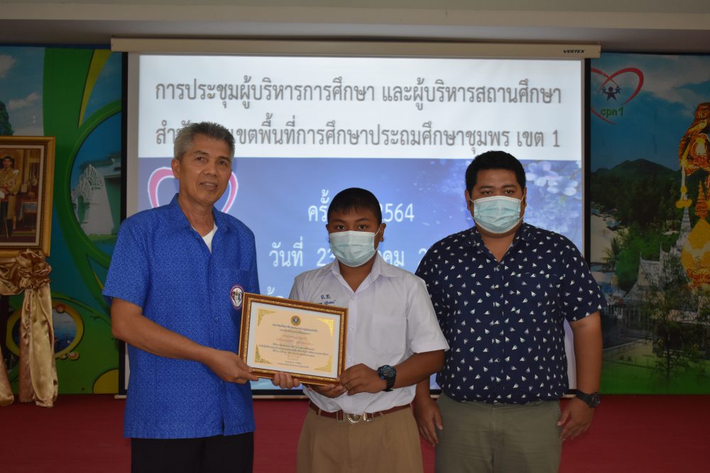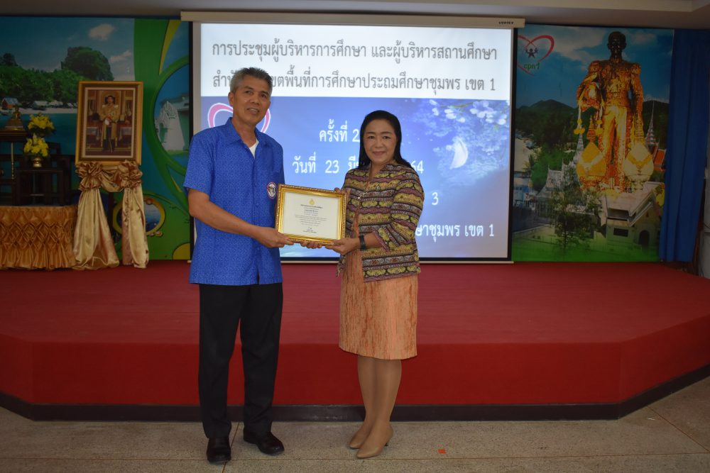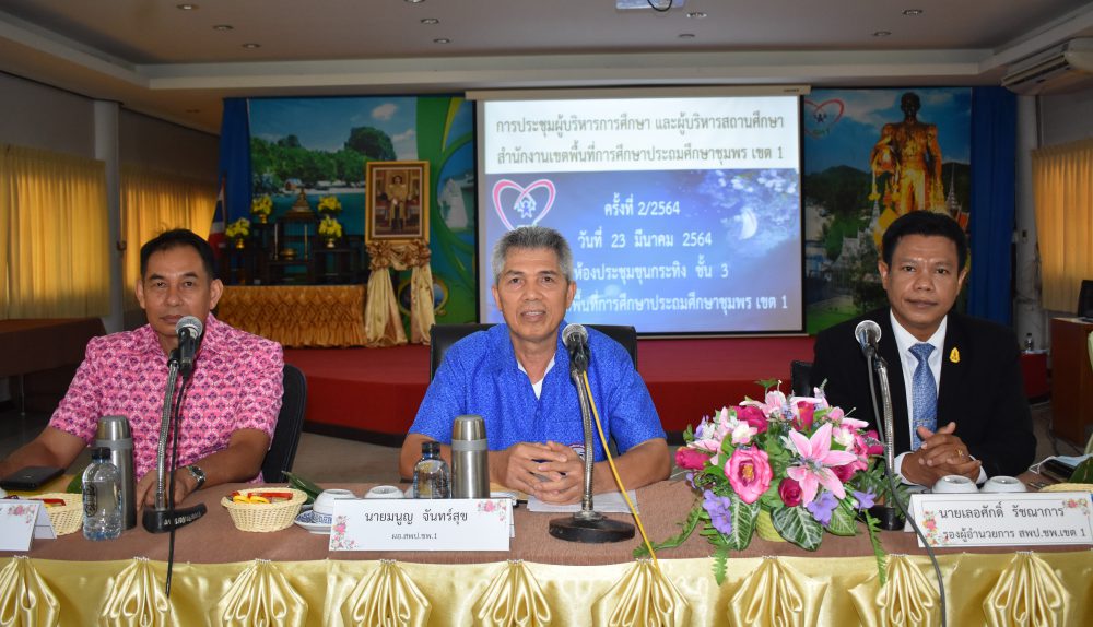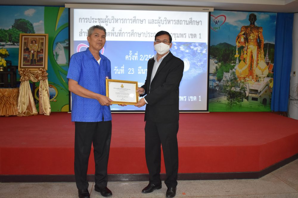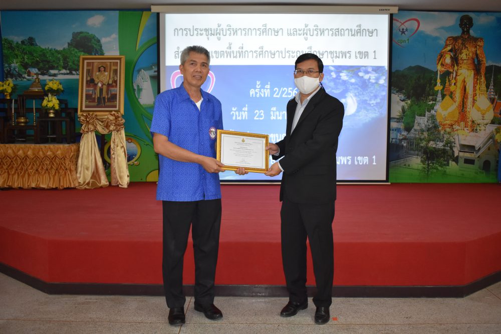 วันที่ 23 มีนาคม 2564 เวลา 09.00 น. นายมนูญ จันทร์สุข ผู้อำนวยการสำนักงานเขตพื้นที่การศึกษาประถมศึกษาชุมพร เขต 1 เป็นประธานการประชุมผู้บริหารการศึกษาและผู้บริหารสถานศึกษา ครั้งที่ 2/2564 ซึ่งก่อนเข้าสู่วาระการประชุม ได้จัดพิธีมอบเกียรติบัตร ใบประกาศเกียรติคุณ ให้แก่ ครู และนักเรียนของโรงเรียนที่มีผลงานโดดเด่น ในรอบปีที่ผ่านมา อาทิ โรงเรียนที่ได้รับการคัดเลือกเป็นโรงเรียนต้นแบบนักเรียนไทยสุขภาพดี รุ่นที่ 6, รางวัลโรงเรียนผลิตคลิปวีดีโอผ่าน TikTok โครงการเฝ้าระวังส่งเสริม สร้างสรรค์วันวาเลนไทน์ ภายใต้มาตรการ โควิด -19, รางวัล"เยาวชนคนดีศรีแผ่นดิน" และผู้บริหารสถานศึกษาที่ได้รับรางวัลพระราชทานระดับมัธยมศึกษา ขนาดเล็ก หลังจากนั้น ประธานการประชุมได้ดำเนินการตามระเบียบวาระการประชุม เพื่อแจ้งนโยบายของสำนักงานคณะกรรมการการศึกษาขั้นพื้นฐาน และนโยบายของกระทรวงศึกษาธิการ ไปสู่โรงเรียนซึ่งเป็นผู้ที่มีส่วนสำคัญในการขับเคลื่อนนโยบายสู่การปฏิบัติ และสร้างความเข้าใจไปยังข้าราชการครูและบุคลากรทางการศึกษาในสังกัด เพื่อร่วมปฏิบัติให้นโยบายบังเกิดผลอย่างมีประสิทธิภาพและประสิทธิผลต่อไป โดยมีรองผู้อำนวยการสำนักงานเขตพื้นที่การศึกษาประถมศึกษาชุมพร เขต 1 และผู้อำนวยการกลุ่ม/หน่วย ร่วมชี้แจงตามระเบียบวาระการประชุมตามลำดับ