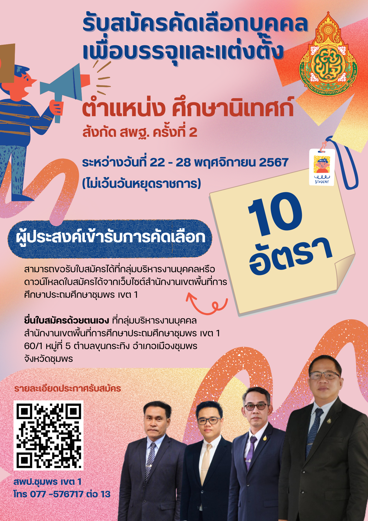 ประกาศ อ.ก.ค.ศ.เขตพื้นที่การศึกษาประถมศึกษาชุมพร เขต 1 เรื่อง รับสมัครคัดเลือกบุคคลเพื่อบรรจุและแต่งตั้งให้ดำรงตำแหน่งศึกษานิเทศก์ สังกัดสำนักงานคณะกรรมการการศึกษาขั้นพื้นฐาน ครั้งที่ 2 ปี พ.ศ.2567 18 พฤศจิกายน 256718 พฤศจิกายน 2024 กลุ่มบริหารงานบุคคล สพป.ชพ.1 การสรรหาและคัคเลือกบุคลากร, ข่าวและกิจกรรม สพป.ชพ.1, ข่าวและกิจกรรมกลุ่มบริหารงานบุคคล, ประกาศตำแหน่งว่าง, ประกาศรับสมัครงาน FacebookFacebookXXLINELine กลุ่มบริหารงานบุคคล สพป.ชพ.1