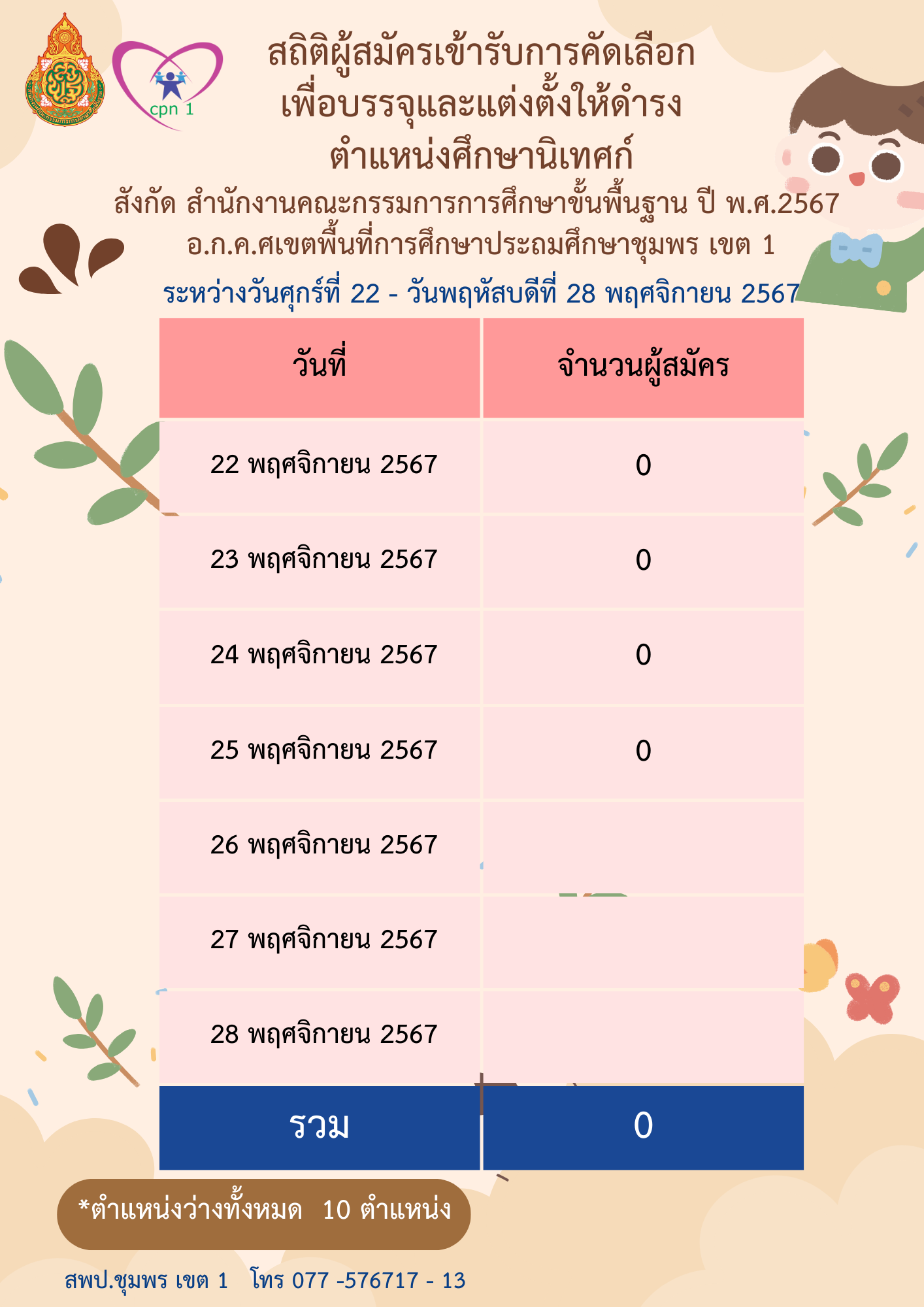 สถิติผู้สมัครรับการคัดเลือกเพื่อบรรจุและแต่งตั้งให้ดำรงตำแหน่งศึกษานิเทศก์ วันที่ 25 พฤศจิกายน 2567 25 พฤศจิกายน 256725 พฤศจิกายน 2024 กลุ่มบริหารงานบุคคล สพป.ชพ.1 ข่าวและกิจกรรม สพป.ชพ.1, ข่าวและกิจกรรมกลุ่มบริหารงานบุคคล FacebookFacebookXXLINELine กลุ่มบริหารงานบุคคล สพป.ชพ.1