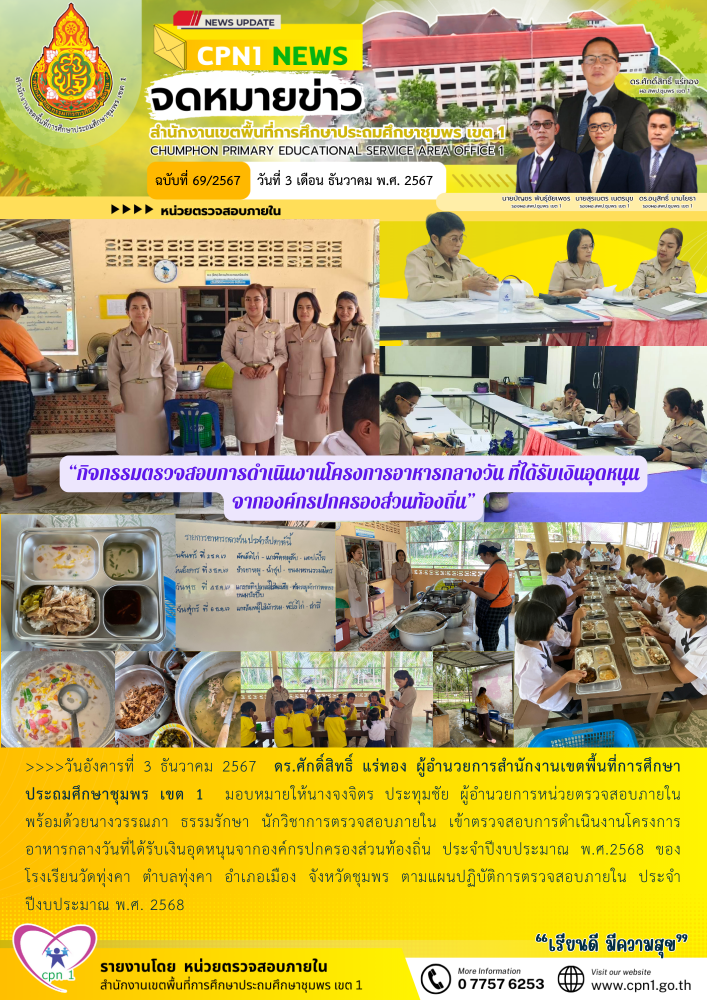 >>>วันอังคารที่ 3 ธันวาคม 2567 ดร.ศักดิ์สิทธิ์ แร่ทอง ผู้อำนวยการสำนักงานเขตพื้นที่การศึกษาประถมศึกษาชุมพร เขต 1 มอบหมายให้นางจงจิตร ประทุมชัย ผู้อำนวยการหน่วยตรวจสอบภายใน พร้อมด้วยนางวรรณภา ธรรมรักษา นักวิชาการตรวจสอบภายใน เข้าตรวจสอบการดำเนินงานโครงการอาหารกลางวันที่ได้รับเงินอุดหนุนจากองค์กรปกครองส่วนท้องถิ่น ประจำปีงบประมาณ พ.ศ.2568 ของโรงเรียนวัดทุ่งคา ตำบลทุ่งคา อำเภอเมือง จังหวัดชุมพร ตามแผนปฏิบัติการตรวจสอบภายใน ประจำปีงบประมาณ พ.ศ. 2568