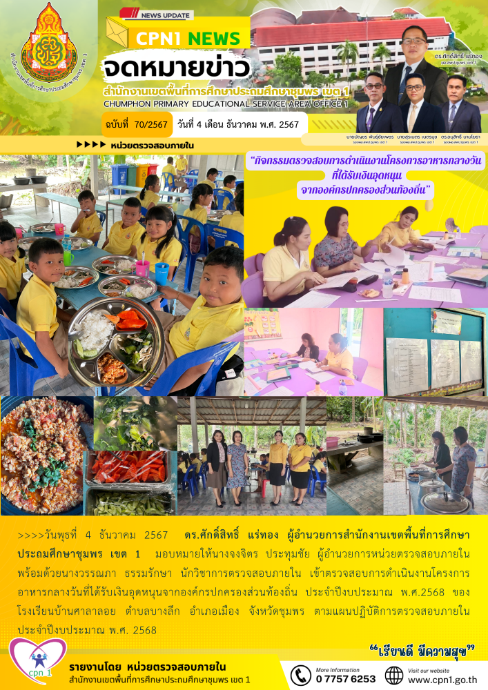 >>>วันพุธที่ 4 ธันวาคม 2567 ดร.ศักดิ์สิทธิ์ แร่ทอง ผู้อำนวยการสำนักงานเขตพื้นที่การศึกษาประถมศึกษาชุมพร เขต 1 มอบหมายให้นางจงจิตร ประทุมชัย ผู้อำนวยการหน่วยตรวจสอบภายใน พร้อมด้วยนางวรรณภา ธรรมรักษา นักวิชาการตรวจสอบภายใน เข้าตรวจสอบการดำเนินงานโครงการอาหารกลางวันที่ได้รับเงินอุดหนุนจากองค์กรปกครองส่วนท้องถิ่น ประจำปีงบประมาณ พ.ศ.2568 ของโรงเรียนบ้านศาลาลอย ตำบลบางลึก อำเภอเมือง จังหวัดชุมพร ตามแผนปฏิบัติการตรวจสอบภายใน ประจำปีงบประมาณ พ.ศ. 2568