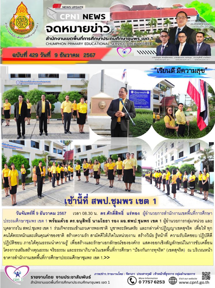 >>..วันจันทร์ที่ 9 ธันวาคม 2567 เวลา 08.30 น. ดร.ศักดิ์สิทธิ์ แร่ทอง ผู้อำนวยการสำนักงานเขตพื้นที่การศึกษาประถมศึกษาชุมพร เขต 1 พร้อมด้วย ดร.อนุสิทธิ์ นามโยธา รอง ผอ.สพป.ชุมพร เขต 1 ผู้อำนวยการกลุ่ม/หน่วย และบุคลากรใน สพป.ชุมพร เขต 1 ร่วมกิจกรรมเข้าแถวเคารพธงชาติ บูชาพระรัตนตรัย และกล่าวคำปฏิญญาเขตสุจริต เพื่อให้ ทุกคนได้ตระหนักและเห็นคุณค่าของชาติ สร้างความรัก สามัคคีให้เกิดในหน่วยงาน สร้างวินัย รู้หน้าที่ ความรับผิดชอบ ปฏิบัติดี ปฏิบัติชอบ ภายใต้คุณธรรมนำความรู้ เพื่อสร้างและรักษาเอกลักษณ์ขององค์กร แสดงออกเชิงสัญลักษณ์ในการขับเคลื่อนโครงการเสริมสร้างคุณธรรม จริยธรรม และธรรมาภิบาลในเขตพื้นที่การศึกษา "ป้องกันการทุจริต" (เขตสุจริต) ณ บริเวณหน้าอาคารสำนักงานเขตพื้นที่การศึกษาประถมศึกษาชุมพร เขต 1.>>