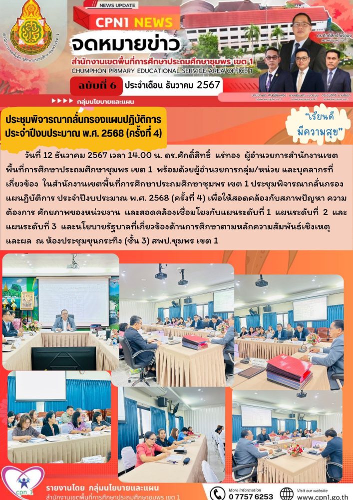 วันที่ 12 ธันวาคม 2567 เวลา 14.00 น. ดร.ศักดิ์สิทธิ์ แร่ทอง ผู้อำนวยการสำนักงานเขตพื้นที่การศึกษาประถมศึกษาชุมพร เขต 1 พร้อมด้วยผู้อำนวยการกลุ่ม/หน่วย และบุคลากรที่เกี่ยวข้อง ในสำนักงานเขตพื้นที่การศึกษาประถมศึกษาชุมพร เขต 1 ประชุมพิจารณากลั่นกรองแผนฏิบัติการ ประจำปีงบประมาณ พ.ศ. 2568 (ครั้งที่ 4) เพื่อให้สอดคล้องกับสภาพปัญหา ความต้องการ ศักยภาพของหน่วยงาน และสอดคล้องเชื่อมโยงกับแผนระดับที่ 1 แผนระดับที่ 2 และแผนระดับที่ 3 และนโยบายรัฐบาลที่เกี่ยวข้องด้านการศึกษาตามหลักความสัมพันธ์เชิงเหตุ และผล ณ ห้องประชุมขุนกระทิง (ชั้น 3) สพป.ชุมพร เขต 1
