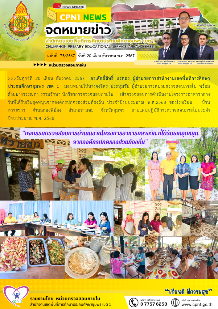 >>วันศุกร์ที่ 20 เดือน ธันวาคม 2567 ดร.ศักดิ์สิทธิ์ แร่ทอง ผู้อำนวยการสำนักงานเขตพื้นที่การศึกษาประถมศึกษาชุมพร เขต 1 มอบหมายให้นางจงจิตร ประทุมชัย ผู้อำนวยการหน่วยตรวจสอบภายใน พร้อมด้วยนางวรรณภา ธรรมรักษา นักวิชาการตรวจสอบภายใน เข้าตรวจสอบการดำเนินงานโครงการอาหารกลางวันที่ได้รับเงินอุดหนุนจากองค์กรปกครองส่วนท้องถิ่น ประจำปีงบประมาณ พ.ศ.2568 ของโรงเรียนบ้านทรายขาว ตำบลสองพี่น้อง อำเภอท่าแซะ จังหวัดชุมพร ตามแผนปฏิบัติการตรวจสอบภายใน ประจำปีงบประมาณ พ.ศ. 2568