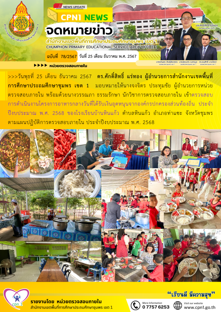 >>วันพุธที่ 25 เดือน ธันวาคม 2567 ดร.ศักดิ์สิทธิ์ แร่ทอง ผู้อำนวยการสำนักงานเขตพื้นที่การศึกษาประถมศึกษาชุมพร เขต 1 มอบหมายให้นางจงจิตร ประทุมชัย ผู้อำนวยการหน่วยตรวจสอบภายใน พร้อมด้วยนางวรรณภา ธรรมรักษา นักวิชาการตรวจสอบภายใน เข้าตรวจสอบการดำเนินงานโครงการอาหารกลางวันที่ได้รับเงินอุดหนุนจากองค์กรปกครองส่วนท้องถิ่น ประจำปีงบประมาณ พ.ศ. 2568 ของโรงเรียนบ้านหินแก้ว ตำบลหินแก้ว อำเภอท่าแซะ จังหวัดชุมพร ตามแผนปฏิบัติการตรวจสอบภายใน ประจำปีงบประมาณ พ.ศ. 2568
