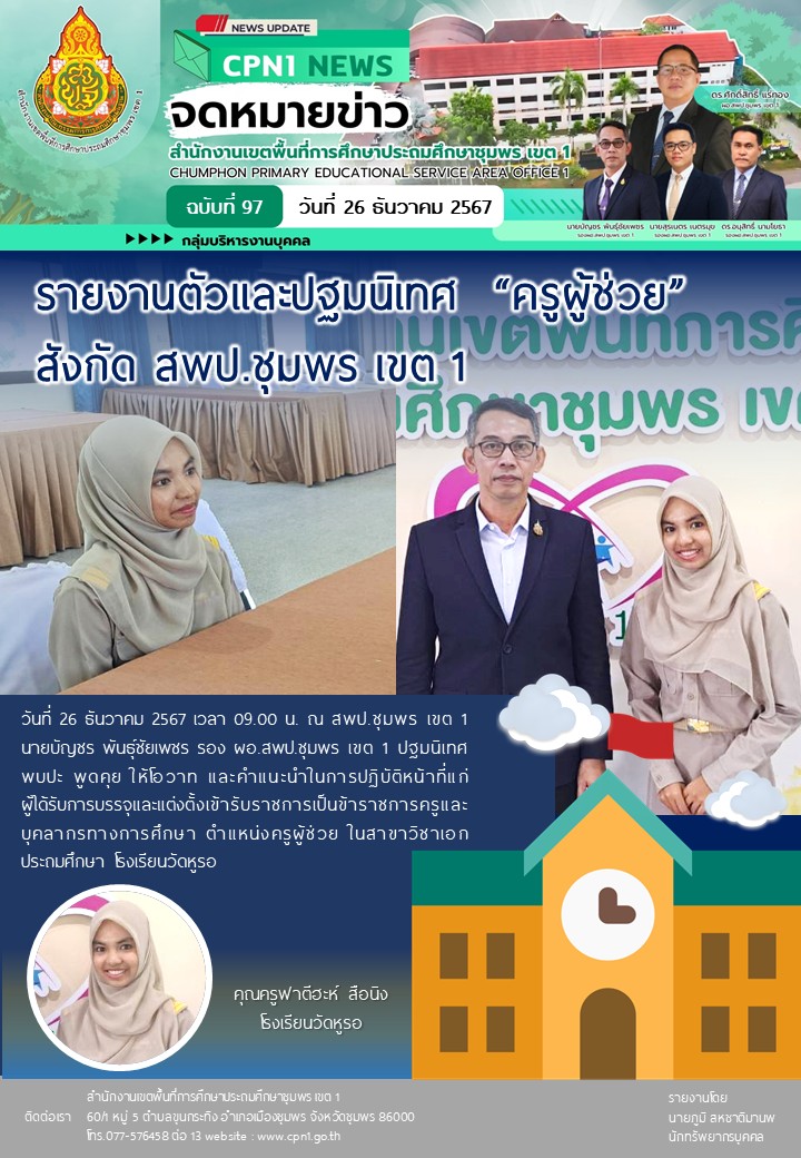 รายงานตัวและปฐมนิเทศ “ครูผู้ช่วย” สังกัด สพป.ชุมพร เขต 1 26 ธันวาคม 256726 ธันวาคม 2024 กลุ่มบริหารงานบุคคล สพป.ชพ.1 ข่าวและกิจกรรม สพป.ชพ.1, ข่าวและกิจกรรมกลุ่มบริหารงานบุคคล FacebookFacebookXXLINELine กลุ่มบริหารงานบุคคล สพป.ชพ.1