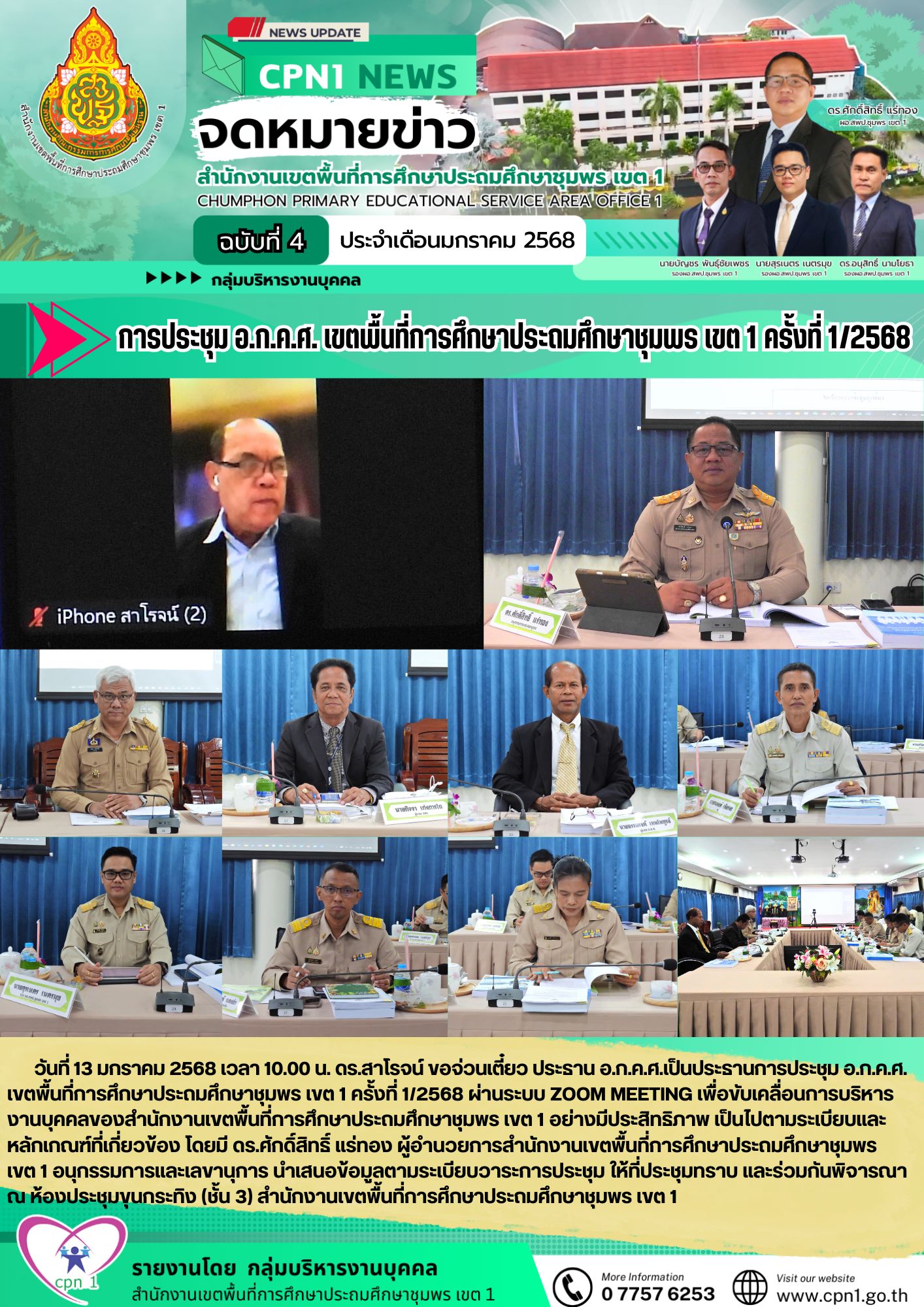 วันที่ 13 มกราคม 2568 เวลา 10.00 น. ดร.สาโรจน์ ขอจ่วนเตี๋ยว ประธาน อ.ก.ค.ศ.เป็นประธานการประชุม อ.ก.ค.ศ.เขตพื้นการศึกษาประถมศึกษาชุมพร เขต 1 ครั้งที่ 1/2568 ผ่านระบบ Zoom Meeting เพื่อขับเคลื่อนการบริหารงานบุคคลของสำนักงานเขตพื้นที่การศึกษาประถมศึกษาชุมพร เขต 1 อย่างมีประสิทธิภาพ เป็นไปตามระเบียบและหลักเกณฑ์ที่เกี่ยวข้อง โดยมี ดร.ศักดิ์สิทธิ์ แร่ทอง ผู้อำนวยการสำนักงานเขตพื้นที่การศึกษาประถมศึกษาชุมพร เขต 1 อนุกรรมการและเลขานุการ นำเสนอข้อมูลตามระเบียบวาระการประชุมให้ที่ประชุมทราบ และร่วมกันพิจารณา ณ ห้องประชุมขุนกระทิง (ชั้น 3) สำนักงานเขตพื้นที่การศึกษาประถมศึกษาชุมพร เขต 1