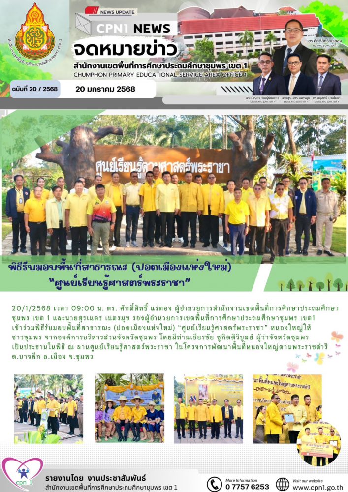 20/1/2568 เวลา 09:00 น. ดร. ศักดิ์สิทธิ์ แร่ทอง ผู้อำนวยการสำนักงานเขตพื้นที่การศึกษาประถมศึกษาชุมพร เขต 1 และนายสุรเนตร เนตรมุข รองผู้อำนวยการเขตพื้นที่การศึกษาประถมศึกษาชุมพร เขต 1 เข้าร่วมพิธีรับมอบพื้นที่สาธารณะ (ปอดเมืองแห่งใหม่) "ศูนย์เรียนรู้ศาสตร์พระราชา" หนองใหญ่ให้ชาวชุมพร จากองค์การบริหารส่วนจังหวัดชุมพร โดยมีท่านเธียรชัย ชูกิตติวิบูลย์ ผู้ว่าจังหวัดชุมพร เป็นประธานในพิธี ณ ลานศูนย์เรียนรู้ศาสตร์พระราชา ในโครงการพัฒนาพื้นที่หนองใหญ่ตามพระราชดำริ ต.บางลึก อ.เมือง จ.ชุมพร