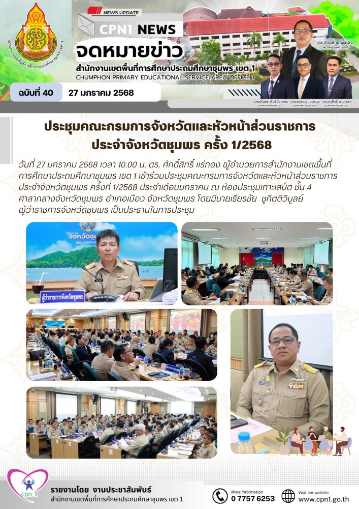 วันที่ 27 มกราคม 2568 เวลา 10.00 น. ดร. ศักดิ์สิทธิ์ แร่ทอง ผู้อำนวยการสำนักงานเขตพื้นที่การศึกษาประถมศึกษาชุมพร เขต 1 เข้าร่วมประชุมคณะกรมการจังหวัดและหัวหน้าส่วนราชการประจำจังหวัดชุมพร ครั้งที่ 1/2568 ประจำเดือนมกราคม ณ ห้องประชุมเกาะเสม็ด ชั้น 4 ศาลากลางจังหวัดชุมพร อำเภอเมือง จังหวัดชุมพร โดยมีนายเธียรชัย ชูกิตติวิบูลย์ ผู้ว่าราชการจังหวัดชุมพร เป็นประธานในการประชุม
