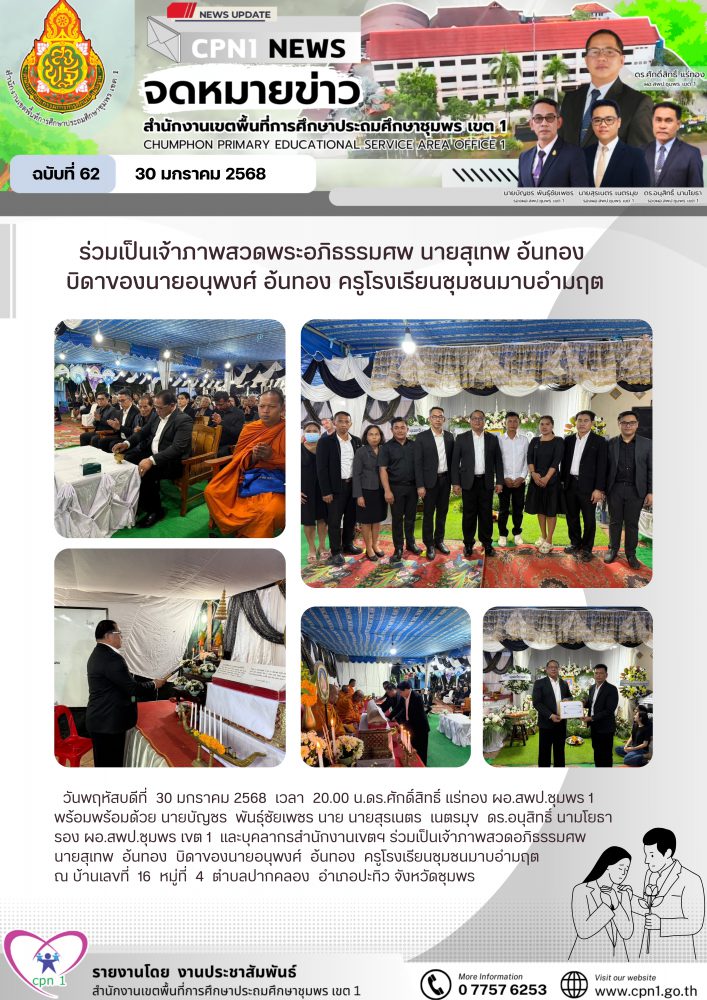 วันที่ 30 มกราคม 2568 เวลา 20.00 น. ดร.ศักดิ์สิทธิ์ แร่ทอง ผู้อำนวยการสำนักงานเขตพื้นที่การศึกษาประถมศึกษาชุมพร เขต 1 พร้อมด้วย นายบัญชร พันธุ์ชัยเพชร , นายสุรเนตร เนตรมุข และ ดร.อนุสิทธิ์ นามโยธา รองผู้อำนวยการสำนักงานเขตพื้นที่การศึกษาฯ รวมถึงคณะบุคลากร ได้เดินทางไปร่วมเป็นเจ้าภาพในพิธีสวดพระอภิธรรมศพ นายสุเทพ อ้นทอง บิดาของนายอนุพงศ์ อ้นทอง ข้าราชการครูโรงเรียนชุมชนมาบอำมฤต