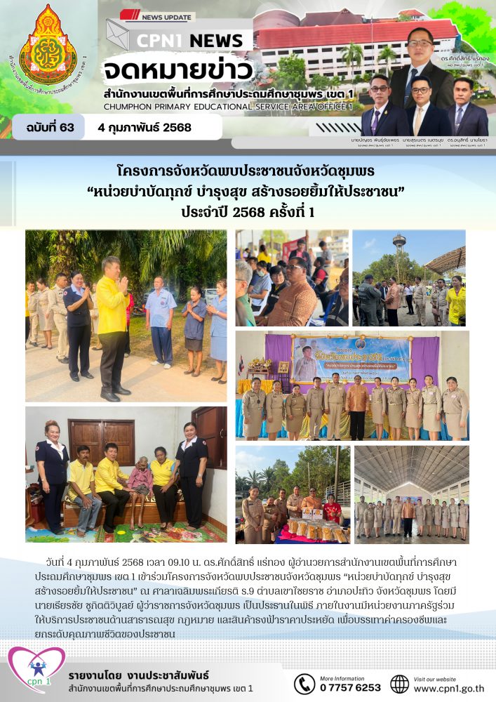 >>>วันที่ 4 กุมภาพันธ์ 2568 เวลา 09.10 น. ดร.ศักดิ์สิทธิ์ แร่ทอง ผู้อำนวยการสำนักงานเขตพื้นที่การศึกษาประถมศึกษาชุมพร เขต 1 เข้าร่วมโครงการจังหวัดพบประชาชนจังหวัดชุมพร "หน่วยบำบัดทุกข์ บำรุงสุข สร้างรอยยิ้มให้ประชาชน" ณ ศาลาเฉลิมพระเกียรติ ร.9 ตำบลเขาไชยราช อำเภอปะทิว จังหวัดชุมพร โดยมี นายเธียรชัย ชูกิตติวิบูลย์ ผู้ว่าราชการจังหวัดชุมพร เป็นประธานในพิธี ภายในงานมีหน่วยงานภาครัฐ และภาคเอกชนร่วมให้บริการประชาชนด้านสาธารณสุข กฎหมาย และสินค้าธงฟ้าราคาประหยัด เพื่อบรรเทาค่าครองชีพและ ยกระดับคุณภาพชีวิตของประชาชน