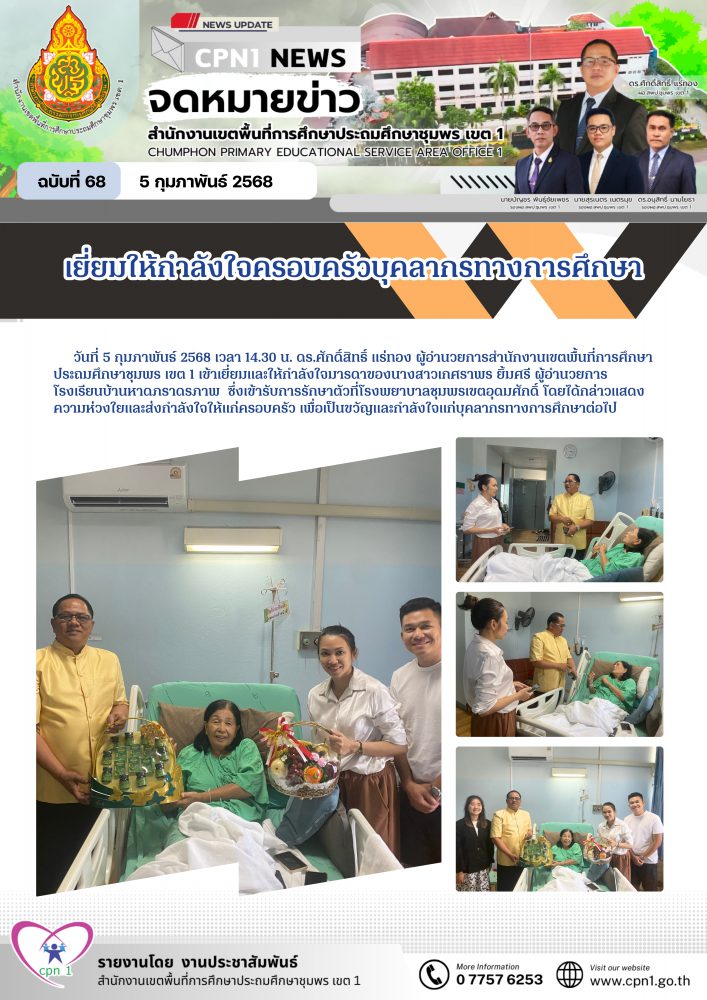 วันที่ 5 กุมภาพันธ์ 2568 เวลา 14.30 น. ดร.ศักดิ์สิทธิ์ แร่ทอง ผู้อำนวยการสำนักงานเขตพื้นที่การศึกษาประถมศึกษาชุมพร เขต 1 เข้าเยี่ยมและให้กำลังใจมารดาของนางสาวเกศราพร ยิ้มศรี ผู้อำนวยการโรงเรียนบ้านหาดภราดรภาพ ซึ่งเข้ารับการรักษาตัวที่โรงพยาบาลชุมพรเขตอุดมศักดิ์ โดยได้กล่าวแสดงความห่วงใยและส่งกำลังใจให้แก่ครอบครัว เพื่อเป็นขวัญและกำลังใจแก่บุคลากรทางการศึกษาต่อไป