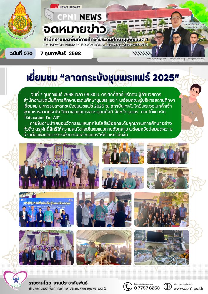 วันที่ 7 กุมภาพันธ์ 2568 เวลา 09.30 น. ดร.ศักดิ์สิทธิ์ แร่ทอง ผู้อำนวยการสำนักงานเขตพื้นที่การศึกษาประถมศึกษาชุมพร เขต 1 พร้อมคณะผู้บริหารสถานศึกษา เยี่ยมชม มหกรรมลาดกระบังชุมพรแฟร์ 2025 ณ สถาบันเทคโนโลยีพระจอมเกล้าเจ้าคุณทหารลาดกระบัง วิทยาเขตชุมพรเขตรอุดมศักดิ์ จังหวัดชุมพร ภายใต้แนวคิด "Education for All"