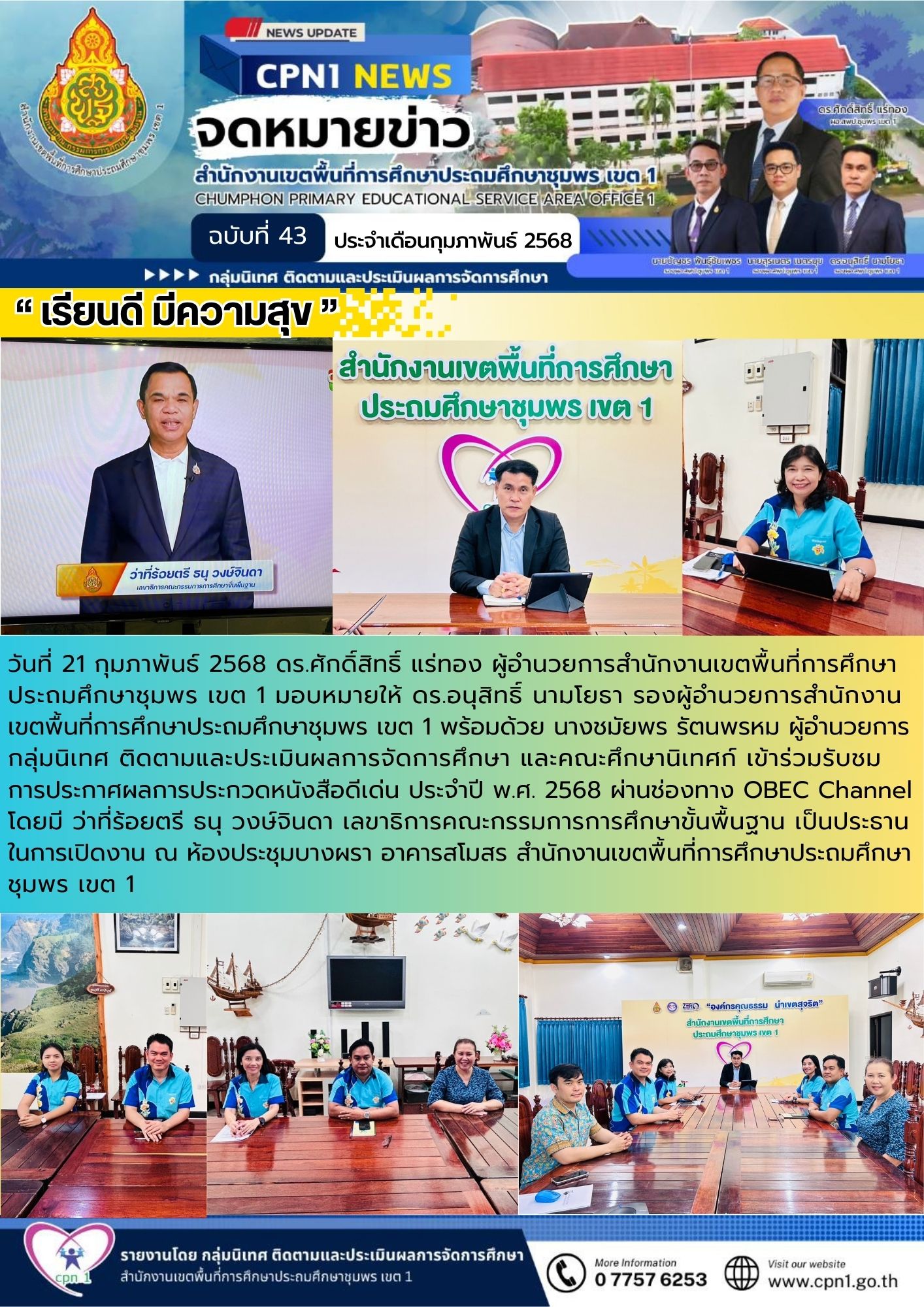วันที่ 21 กุมภาพันธ์ 2568 ดร.ศักดิ์สิทธิ์ แร่ทอง ผู้อำนวยการสำนักงานเขตพื้นที่การศึกษาประถมศึกษาชุมพร เขต 1 มอบหมายให้