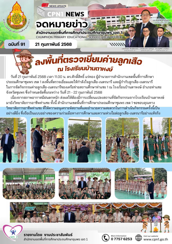 วันที่ 21 กุมภาพันธ์ 2568 เวลา 11.00 น. ดร.ศักดิ์สิทธิ์ แร่ทอง ผู้อำนวยการสำนักงานเขตพื้นที่การศึกษา ประถมศึกษาชุมพร เขต 1 ลงพื้นที่ตรวจเยี่ยมและให้กำลังใจลูกเสือ-เนตรนารี และผู้กำกับลูกเสือ-เนตรนารี ในการจัดกิจกรรมค่ายลูกเสือ-เนตรนารีของเครือข่ายสถานศึกษาท่าแซะ 1 ณ โรงเรียนบ้านตาหงษ์ อำเภอท่าแซะ จังหวัดชุมพร ซึ่งกำหนดจัดขึ้นระหว่าง วันที่ 21 – 22 กุมภาพันธ์ 2568