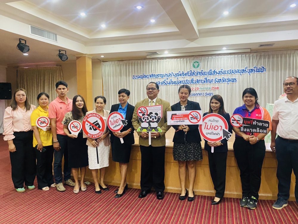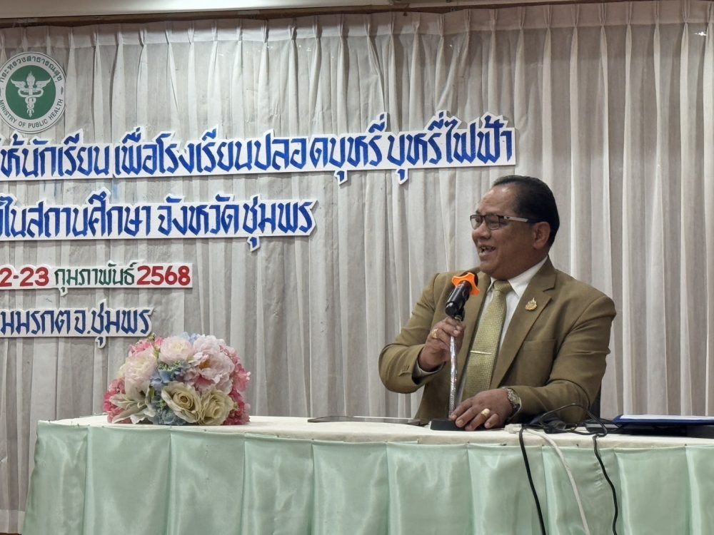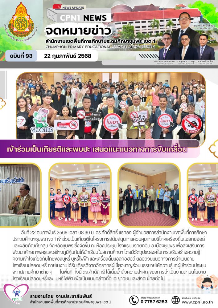 วันที่ 22 กุมภาพันธ์ 2568 เวลา 08.30 น. ดร.ศักดิ์สิทธิ์ แร่ทอง ผู้อำนวยการสำนักงานเขตพื้นที่การศึกษาประถมศึกษาชุมพร เขต 1 เข้าร่วมเป็นเกีบรติโครงการสนับสนุนการควบคุมการบริโภคเครื่องดื่มแอลกอฮอล์และผลิตภัณฑ์ยาสูบ จังหวัดชุมพร ซึ่งจัดขึ้น ณ ห้องประชุม โรงแรมมรกตทวิน อ.เมืองชุมพร เพื่อส่งเสริมการพัฒนาศักยภาพครูและสร้างภูมิคุ้มกันให้นักเรียนในสถานศึกษา โดยมีวัตถุประสงค์ในการเสริมสร้างความรู้ ความเข้าใจเกี่ยวกับโทษของบุหรี่ บุหรี่ไฟฟ้า และเครื่องดื่มแอลกอฮอล์ ตลอดจนแนวทางการดำเนินงานโรงเรียนปลอดบุหรี่ ภายในงานได้รับเกียรติจากวิทยากรผู้เชี่ยวชาญร่วมบรรยายให้ความรู้แก่ผู้เข้าร่วมประชุมจากสถานศึกษาต่าง ๆ ในพื้นที่ ทั้งนี้ ดร.ศักดิ์สิทธิ์ ได้เน้นย้ำถึงความสำคัญของการดำเนินงานตามนโยบายโรงเรียนปลอดบุหรี่และ บุหรี่ไฟฟ้า เพื่อเป็นแบบอย่างที่ดีแก่เยาวชนและสังคมไทยต่อไป