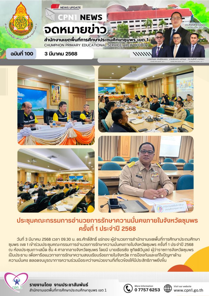 วันที่ 3 มีนาคม 2568 เวลา 09.30 น. ดร.ศักดิ์สิทธิ์ แร่ทอง ผู้อำนวยการสำนักงานเขตพื้นที่การศึกษาประถมศึกษาชุมพร เขต 1 เข้าร่วมประชุมคณะกรรมการอำนวยการรักษาความมั่นคงภายในจังหวัดชุมพร ครั้งที่ 1 ประจำปี 2568 ณ ห้องประชุมเกาะเสม็ด ชั้น 4 ศาลากลางจังหวัดชุมพร โดยมี นายเธียรชัย ชูกิตติวิบูลย์ ผู้ว่าราชการจังหวัดชุมพร เป็นประธาน เพื่อหารือแนวทางการรักษาความสงบเรียบร้อยภายในจังหวัด การป้องกันและแก้ไขปัญหาด้าน ความมั่นคง ตลอดจนบูรณาการความร่วมมือระหว่างหน่วยงานที่เกี่ยวข้องให้มีประสิทธิภาพยิ่งขึ้น