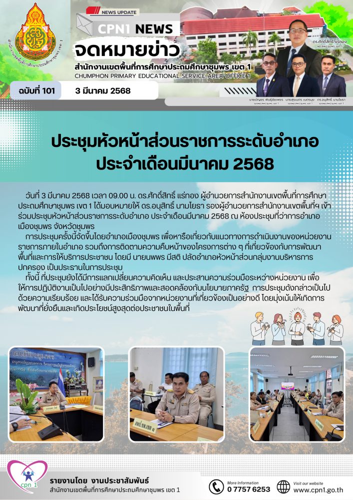 วันที่ 3 มีนาคม 2568 เวลา 09.00 น. ดร.ศักดิ์สิทธิ์ แร่ทอง ผู้อำนวยการสำนักงานเขตพื้นที่การศึกษาประถมศึกษาชุมพร เขต 1 ได้มอบหมายให้ ดร.อนุสิทธิ์ นามโยธา รองผู้อำนวยการสำนักงานเขตพื้นที่ฯ เข้าร่วมประชุมหัวหน้าส่วนราชการระดับอำเภอ ประจำเดือนมีนาคม 2568 ณ ห้องประชุมที่ว่าการอำเภอเมืองชุมพร จังหวัดชุมพร