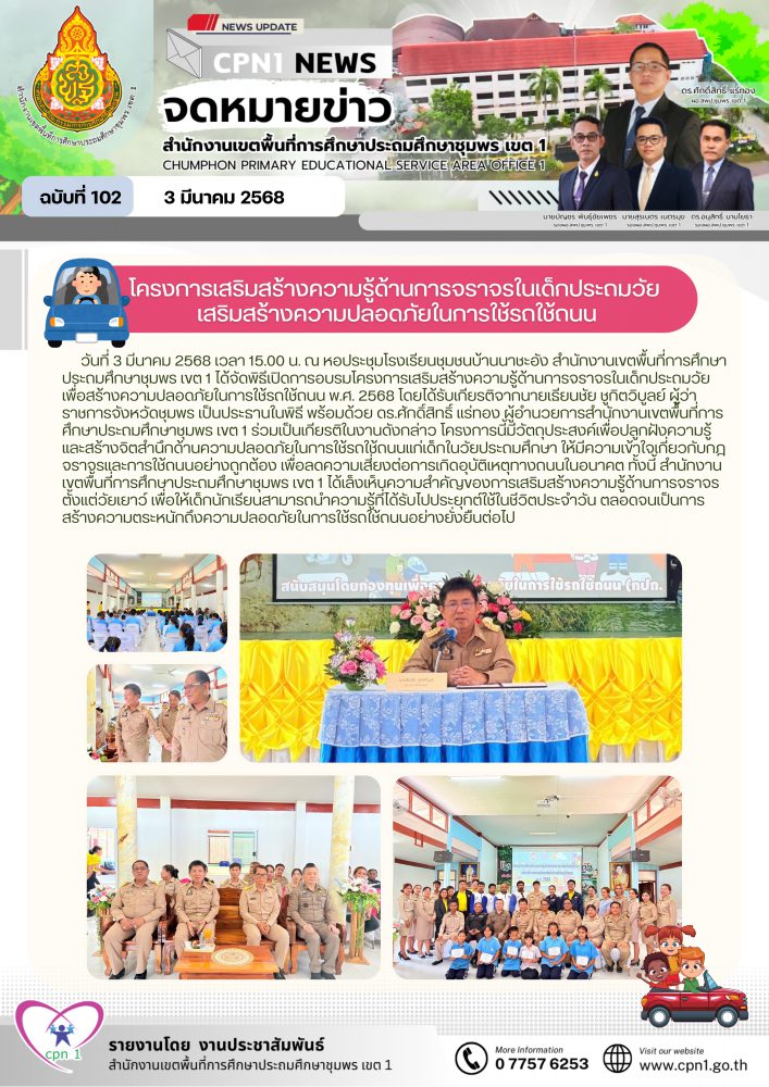 วันที่ 3 มีนาคม 2568 เวลา 15.00 น. ณ หอประชุมโรงเรียนชุมชนบ้านนาชะอัง สำนักงานเขตพื้นที่การศึกษาประถมศึกษาชุมพร เขต 1 ได้จัดพิธีเปิดการอบรมโครงการเสริมสร้างความรู้ด้านการจราจรในเด็กประถมวัย เพื่อสร้างความปลอดภัยในการใช้รถใช้ถนน พ.ศ. 2568 โดยได้รับเกียรติจากนายเธียนชัย ชูกิตวิบูลย์ ผู้ว่าราชการจังหวัดชุมพร เป็นประธานในพิธี พร้อมด้วย ดร.ศักดิ์สิทธิ์ แร่ทอง ผู้อำนวยการสำนักงานเขตพื้นที่การศึกษาประถมศึกษาชุมพร เขต 1 ร่วมเป็นเกียรติในงานดังกล่าว โครงการนี้มีวัตถุประสงค์เพื่อปลูกฝังความรู้และสร้างจิตสำนึกด้านความปลอดภัยในการใช้รถใช้ถนนแก่เด็กในวัยประถมศึกษา ให้มีความเข้าใจเกี่ยวกับกฎจราจรและการใช้ถนนอย่างถูกต้อง เพื่อลดความเสี่ยงต่อการเกิดอุบัติเหตุทางถนนในอนาคต ทั้งนี้ สำนักงานเขตพื้นที่การศึกษาประถมศึกษาชุมพร เขต 1 ได้เล็งเห็นความสำคัญของการเสริมสร้างความรู้ด้านการจราจรตั้งแต่วัยเยาว์ เพื่อให้เด็กนักเรียนสามารถนำความรู้ที่ได้รับไปประยุกต์ใช้ในชีวิตประจำวัน ตลอดจนเป็นการสร้างความตระหนักถึงความปลอดภัยในการใช้รถใช้ถนนอย่างยั่งยืนต่อไป