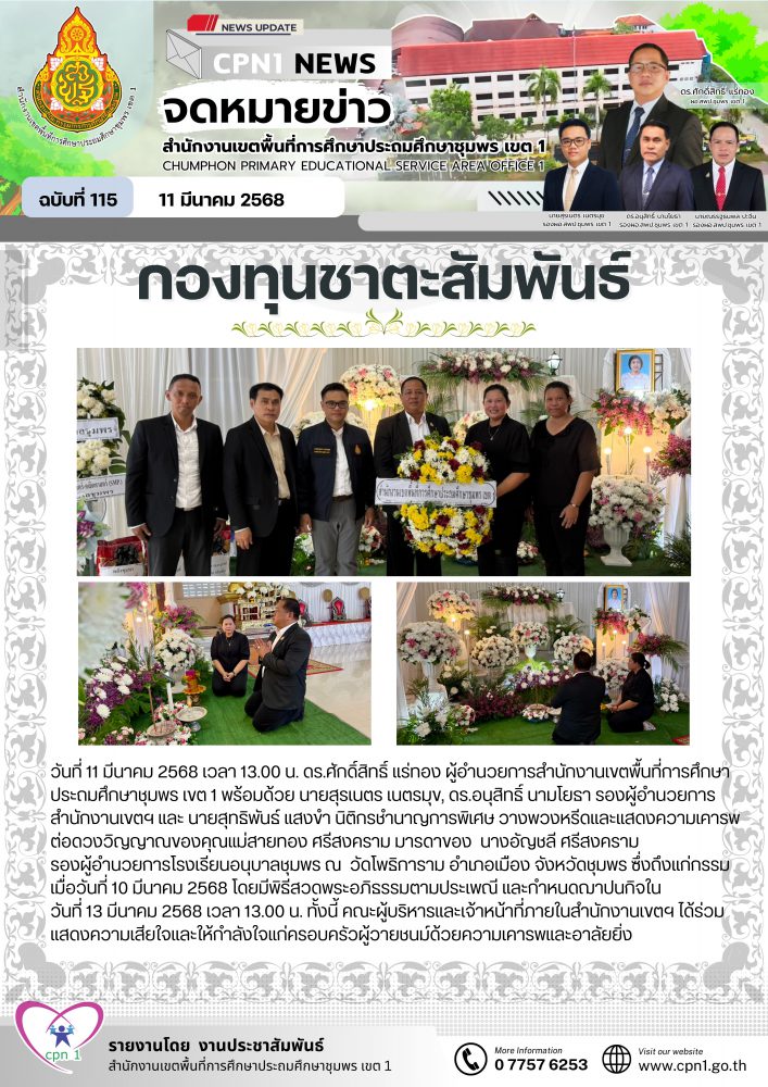 วันที่ 11 มีนาคม 2568 เวลา 13.00 น. ดร.ศักดิ์สิทธิ์ แร่ทอง ผู้อำนวยการสำนักงานเขตพื้นที่การศึกษาประถมศึกษาชุมพร เขต 1 พร้อมด้วย นายสุรเนตร เนตรมุข, ดร.อนุสิทธิ์ นามโยธา รองผู้อำนวยการสำนักงานเขตฯ และ นายสุทธิพันธ์ แสงขำ นิติกรชำนาญการพิเศษ วางพวงหรีดและแสดงความเคารพต่อดวงวิญญาณของคุณแม่สายทอง ศรีสงคราม มารดาของ นางอัญชลี ศรีสงคราม รองผู้อำนวยการโรงเรียนอนุบาลชุมพร ณ วัดโพธิการาม อำเภอเมือง จังหวัดชุมพร ซึ่งถึงแก่กรรมเมื่อวันที่ 10 มีนาคม 2568 โดยมีพิธีสวดพระอภิธรรมตามประเพณี และกำหนดฌาปนกิจใน วันที่ 13 มีนาคม 2568 เวลา 13.00 น. ทั้งนี้ คณะผู้บริหารและเจ้าหน้าที่ภายในสำนักงานเขตฯ ได้ร่วมแสดงความเสียใจและให้กำลังใจแก่ครอบครัวผู้วายชนม์ด้วยความเคารพและอาลัยยิ่ง