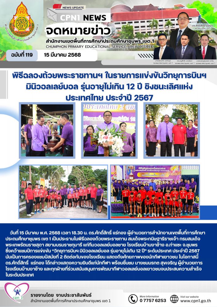 วันที่ 15 มีนาคม พ.ศ. 2568 เวลา 18.30 น. ดร.ศักดิ์สิทธิ์ แร่ทอง ผู้อำนวยการสำนักงานเขตพื้นที่การศึกษาประถมศึกษาชุมพร เขต 1 เป็นประธานในพิธีฉลองถ้วยพระราชทาน สมเด็จพระกนิษฐาธิราชเจ้า กรมสมเด็จพระเทพรัตนราชสุดา สยามบรมราชกุมารี แก่ทีมวอลเลย์บอลชาย โรงเรียนบ้านงาช้าง อ.ท่าแซะ จ.ชุมพร ซึ่งคว้าแชมป์การแข่งขัน "วิทยุการบินฯ มินิวอลเลย์บอล รุ่นอายุไม่เกิน 12 ปี" ระดับประเทศ ประจำปี 2567 นับเป็นการครองแชมป์สมัยที่ 2 ติดต่อกันของโรงเรียน แสดงถึงศักยภาพของนักกีฬาเยาวชน ในโอกาสนี้ ดร.ศักดิ์สิทธิ์ แร่ทอง ได้กล่าวแสดงความยินดีแก่นักกีฬา พร้อมชื่นชม นางชมมรกต สุขเจริญ ผู้อำนวยการโรงเรียนบ้านงาช้าง และทุกฝ่ายที่ร่วมสนับสนุนการพัฒนากีฬาวอลเลย์บอลเยาวชนจนประสบความสำเร็จในระดับประเทศ