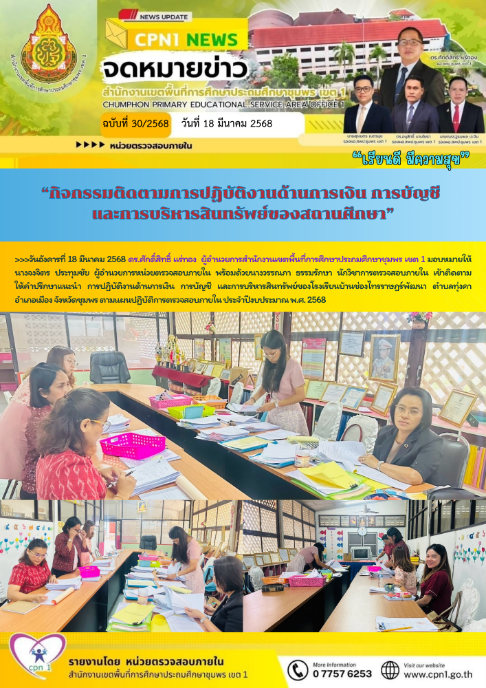 >>วันอังคารที่ 18 มีนาคม 2568 ดร.ศักดิ์สิทธิ์ แร่ทอง ผู้อำนวยการสำนักงานเขตพื้นที่การศึกษาประถมศึกษาชุมพร เขต 1มอบหมายให้นางจงจิตร ประทุมชัย ผู้อำนวยการหน่วยตรวจสอบภายใน พร้อมด้วยนางวรรณภา ธรรมรักษา นักวิชาการตรวจสอบภายใน เข้าติดตาม ให้คำปรึกษาแนะนำ การปฏิบัติงานด้านการเงิน การบัญชี และการบริหารสินทรัพย์ของโรงเรียนบ้านช่องไทรราษฎร์พัฒนา ตำบลทุ่งคา อำเภอเมือง จังหวัดชุมพร ตามแผนปฏิบัติการตรวจสอบภายใน ประจำปีงบประมาณ พ.ศ. 2568