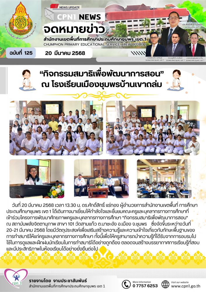 วันที่ 20 มีนาคม 2568 เวลา 13.30 น. ดร.ศักดิ์สิทธิ์ แร่ทอง ผู้อำนวยการสำนักงานเขตพื้นที่ การศึกษาประถมศึกษาชุมพร เขต 1 ได้เดินทางมาเยี่ยมให้กำลังใจและชื่นชมคณะครูและบุคลากรทางการศึกษาที่ เข้าร่วมโครงการพัฒนาศักยภาพครูและบุคลากรทางการศึกษา "กิจกรรมสมาธิเพื่อพัฒนาการสอน" ณ สถาบันพลังจิตตานุภาพ สาขา 101 วัดสามแก้ว ต.นาชะอัง อ.เมือง จ.ชุมพร ซึ่งจัดขึ้นระหว่างวันที่ 20-21 มีนาคม 2568 โดยมีวัตถุประสงค์เพื่อเสริมสร้างความรู้และความเข้าใจเกี่ยวกับทักษะพื้นฐานของการทำสมาธิให้แก่ครูและบุคลากรทางการศึกษา ทั้งนี้เพื่อให้ครูสามารถนำความรู้ที่ได้รับจากการอบรมไปใช้ในการดูแลและฝึกฝนนักเรียนในการทำสมาธิได้อย่างถูกต้อง ตลอดจนสร้างบรรยากาศการเรียนรู้ที่สงบและมีประสิทธิภาพในห้องเรียนได้อย่างยั่งยืนต่อไป