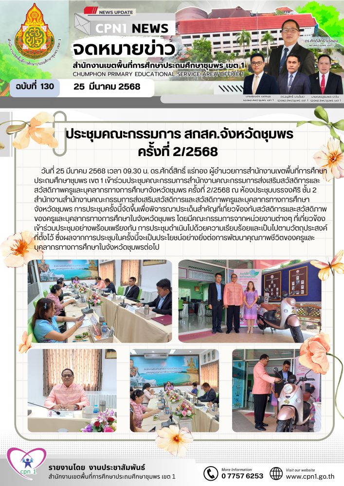 วันที่ 25 มีนาคม 2568 เวลา 09.30 น. ดร.ศักดิ์สิทธิ์ แร่ทอง ผู้อำนวยการสำนักงานเขตพื้นที่การศึกษาประถมศึกษาชุมพร เขต 1 เข้าร่วมประชุมคณะกรรมการสำนักงานคณะกรรมการส่งเสริมสวัสดิการและสวัสดิภาพครูและบุคลากรทางการศึกษาจังหวัดชุมพร ครั้งที่ 2/2568 ณ ห้องประชุมบรรจงศิริ ชั้น 2 สำนักงานสำนักงานคณะกรรมการส่งเสริมสวัสดิการและสวัสดิภาพครูและบุคลากรทางการศึกษาจังหวัดชุมพร การประชุมครั้งนี้จัดขึ้นเพื่อพิจารณาประเด็นสำคัญที่เกี่ยวข้องกับสวัสดิการและสวัสดิภาพของครูและบุคลากรทางการศึกษาในจังหวัดชุมพร โดยมีคณะกรรมการจากหน่วยงานต่างๆ ที่เกี่ยวข้องเข้าร่วมประชุมอย่างพร้อมเพรียงกัน การประชุมดำเนินไปด้วยความเรียบร้อยและเป็นไปตามวัตถุประสงค์ที่ตั้งไว้ ซึ่งผลจากการประชุมในครั้งนี้จะเป็นประโยชน์อย่างยิ่งต่อการพัฒนาคุณภาพชีวิตของครูและบุคลากรทางการศึกษาในจังหวัดชุมพรต่อไป
