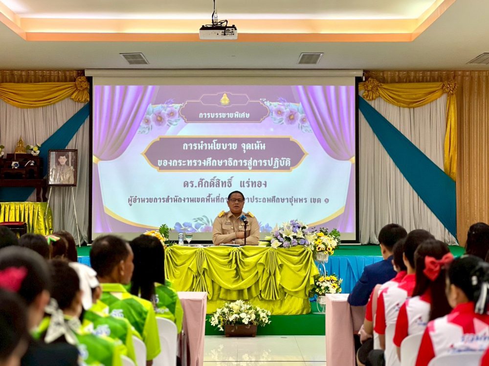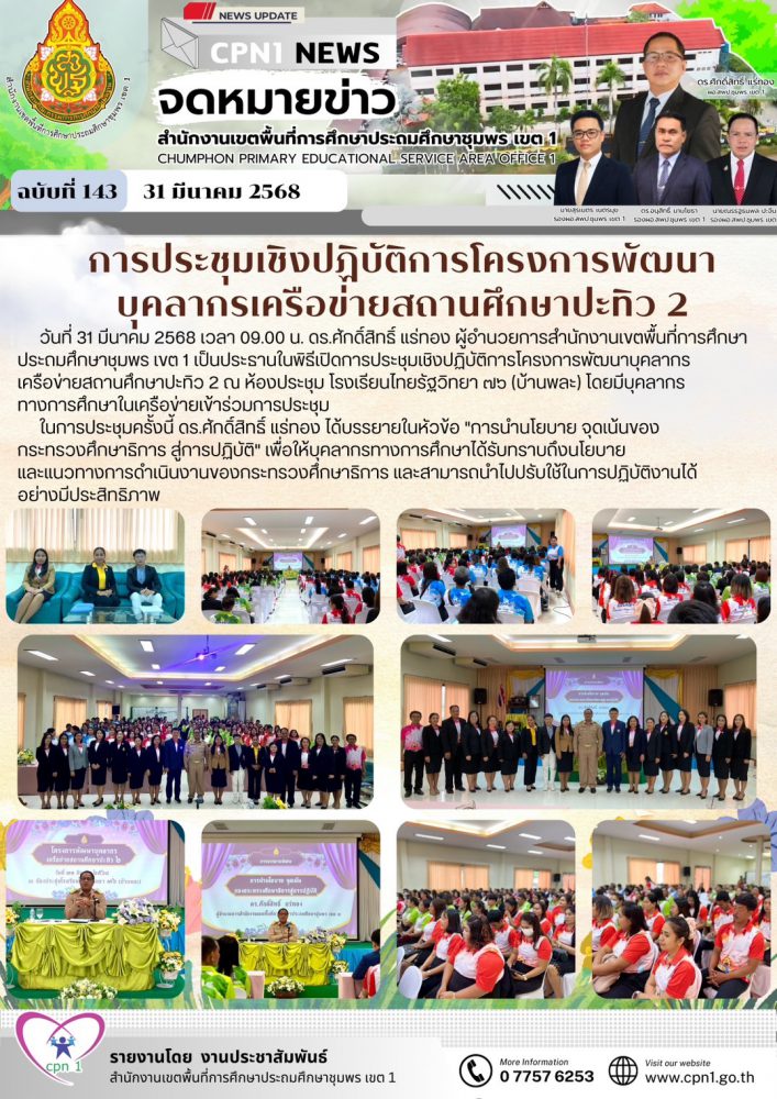 วันที่ 31 มีนาคม 2568 เวลา 09.00 น. ดร.ศักดิ์สิทธิ์ แร่ทอง ผู้อำนวยการสำนักงานเขตพื้นที่การศึกษาประถมศึกษาชุมพร เขต 1 เป็นประธานในพิธีเปิดการประชุมเชิงปฏิบัติการโครงการพัฒนาบุคลากร เครือข่ายสถานศึกษาปะทิว 2 ณ ห้องประชุม โรงเรียนไทยรัฐวิทยา ๗๖ (บ้านพละ) โดยมีบุคลากร ทางการศึกษาในเครือข่ายเข้าร่วมการประชุม
