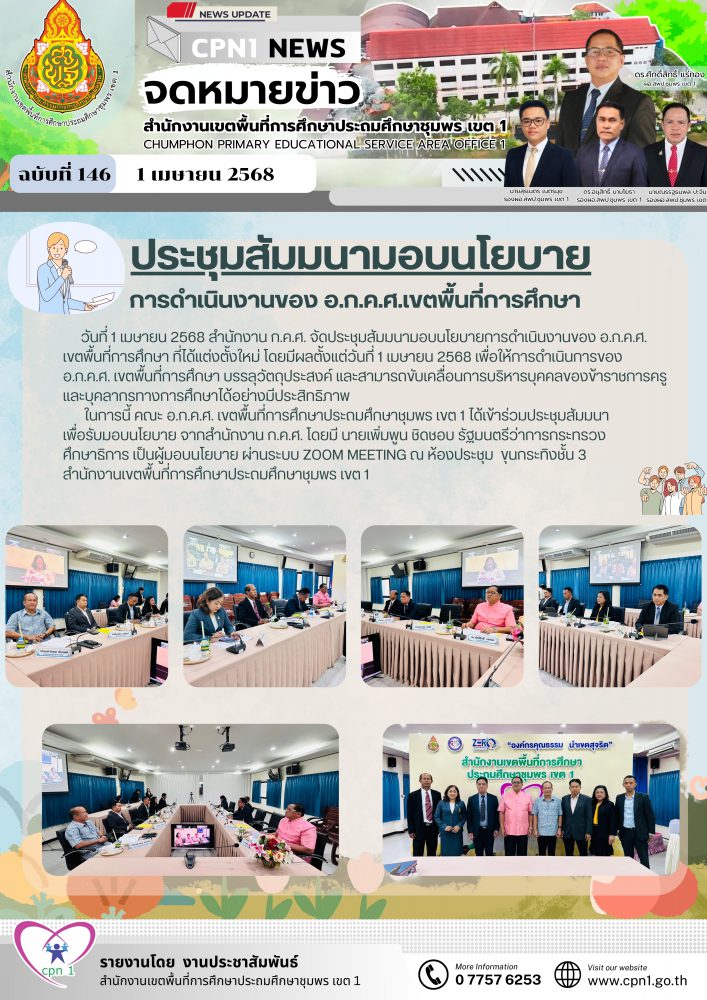 ในการนี้ คณะ อ.ก.ค.ศ. เขตพื้นที่การศึกษาประถมศึกษาชุมพร เขต 1 ได้เข้าร่วมประชุมสัมมนา เพื่อรับมอบนโยบาย จากสำนักงาน จากสำนักงาน ก.ค.ศ. โดยมี นายเพิ่มพูน ชิดชอบ รัฐมนตรีว่าการกระทรวงศึกษาธิการมอบนโยบาย เป็นผู้มอบนโยบาย ผ่านระบบ ZOOM ณ ห้องประชุม ขุนกระทิงชั้น 3 สำนักงานเขตพื้นที่การศึกษาประถมศึกษาชุมพร เขต 1