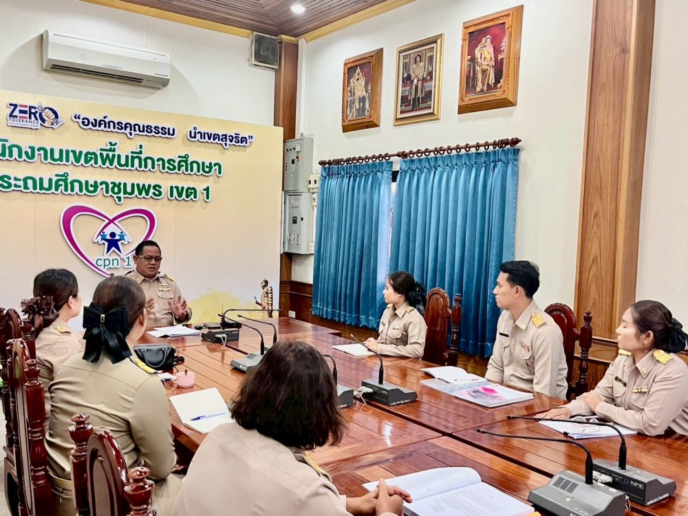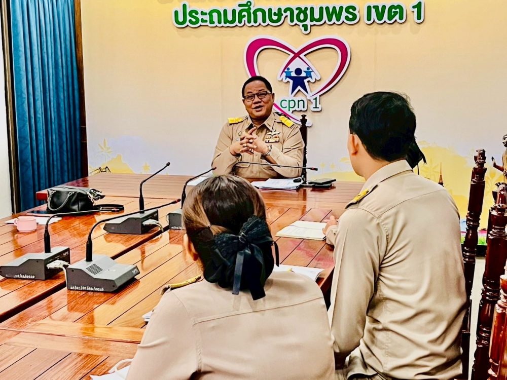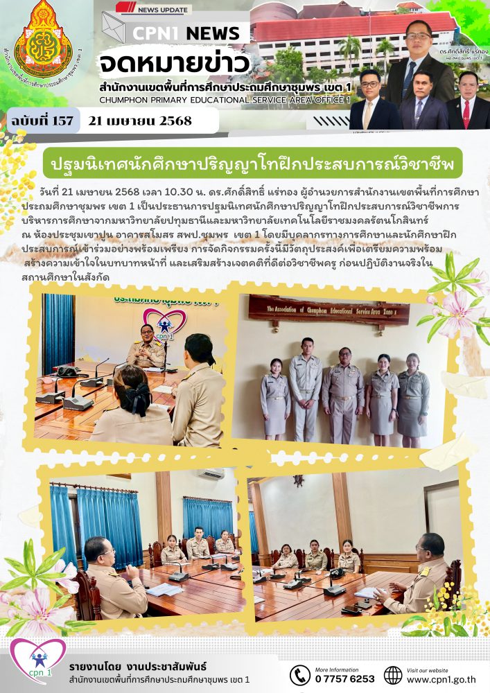 วันที่ 21 เมษายน 2568 เวลา 10.30 น. ดร.ศักดิ์สิทธิ์ แร่ทอง ผู้อำนวยการสำนักงานเขตพื้นที่การศึกษาประถมศึกษาชุมพร เขต 1 เป็นประธานการปฐมนิเทศนักศึกษาปริญญาโทฝึกประสบการณ์วิชาชีพการบริหารการศึกษาจากมหาวิทยาลัยปทุมธานีและมหาวิทยาลัยเทคโนโลยีราชมงคลรัตนโกสินทร์ ณ ห้องประชุมเขาปูน อาคารสโมสร สพป.ชุมพร เขต 1 โดยมีบุคลากรทางการศึกษาและนักศึกษาฝึกประสบการณ์เข้าร่วมอย่างพร้อมเพรียง การจัดกิจกรรมครั้งนี้มีวัตถุประสงค์เพื่อเตรียมความพร้อม สร้างความเข้าใจในบทบาทหน้าที่ และเสริมสร้างเจตคติที่ดีต่อวิชาชีพครู ก่อนปฏิบัติงานจริงใน สถานศึกษาในสังกัด