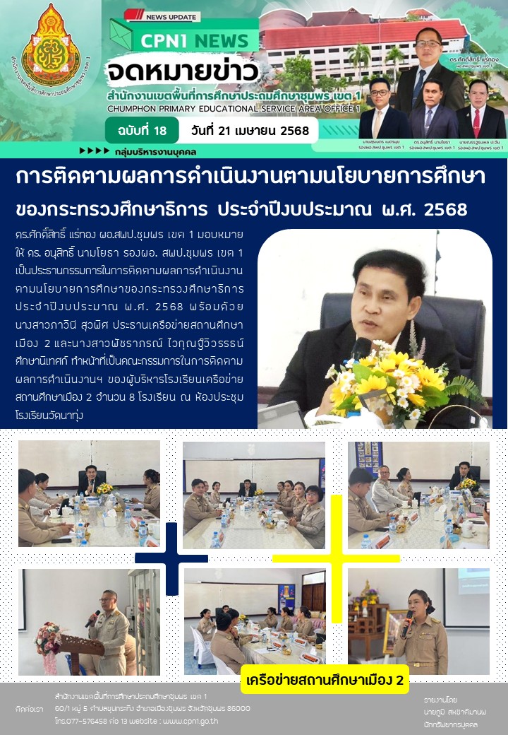 การติดตามผลการดำเนินงานตามนโยบายการศึกษาของกระทรวงศึกษาธิการ ประจำปีงบประมาณ พ.ศ. 2568 เครือข่ายสถานศึกษาเมือง 2 22 เมษายน 256822 เมษายน 2025 กลุ่มบริหารงานบุคคล สพป.ชพ.1 ข่าวและกิจกรรมกลุ่มบริหารงานบุคคล FacebookFacebookXXLINELine กลุ่มบริหารงานบุคคล สพป.ชพ.1