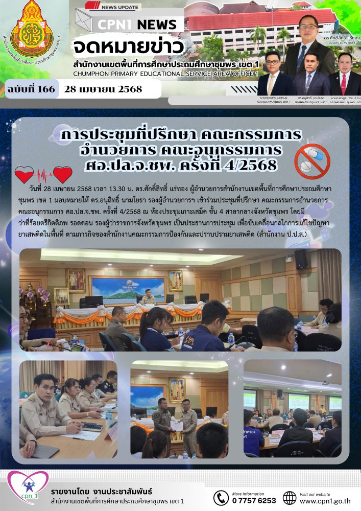 วันที่ 28 เมษายน 2568 เวลา 13.30 น. ดร.ศักดิ์สิทธิ์ แร่ทอง ผู้อำนวยการสำนักงานเขตพื้นที่การศึกษาประถมศึกษาชุมพร เขต 1 มอบหมายให้ ดร.อนุสิทธิ์ นามโยธา รองผู้อำนวยการฯ เข้าร่วมประชุมที่ปรึกษา คณะกรรมการอำนวยการ คณะอนุกรรมการ ศอ.ปล.จ.ชพ. ครั้งที่ 4/2568 ณ ห้องประชุมเกาะเสม็ด ชั้น 4 ศาลากลางจังหวัดชุมพร โดยมี ว่าที่ร้อยตรีกิตติภพ รอดดอน รองผู้ว่าราชการจังหวัดชุมพร เป็นประธานการประชุม เพื่อขับเคลื่อนกลไกการแก้ไขปัญหา ยาเสพติดในพื้นที่ ตามภารกิจของสำนักงานคณะกรรมการป้องกันและปราบปรามยาเสพติด (สำนักงาน ป.ป.ส.)