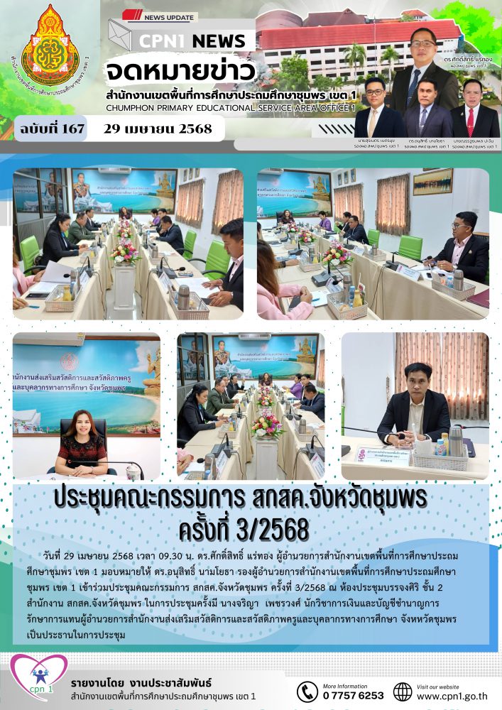 วันที่ 29 เมษายน 2568 เวลา 09.30 น. ดร.ศักดิ์สิทธิ์ แร่ทอง ผู้อำนวยการสำนักงานเขตพื้นที่การศึกษาประถมศึกษาชุมพร เขต 1 มอบหมายให้ ดร.อนุสิทธิ์ นามโยธา รองผู้อำนวยการสำนักงานเขตพื้นที่การศึกษาประถมศึกษาชุมพร เขต 1 เข้าร่วมประชุมคณะกรรมการ สกสค.จังหวัดชุมพร ครั้งที่ 3/2568 ณ ห้องประชุมบรรจงศิริ ชั้น 2 สำนักงาน สกสค.จังหวัดชุมพร ในการประชุมครั้งมี นางจริญา เพชรวงศ์ นักวิชาการเงินและบัญชีชำนาญการ รักษาการแทนผู้อำนวยการสำนักงานส่งเสริมสวัสดิการและสวัสดิภาพครูและบุคลากรทางการศึกษา จังหหวัดชุมพร เป็นประธานในการประชุม