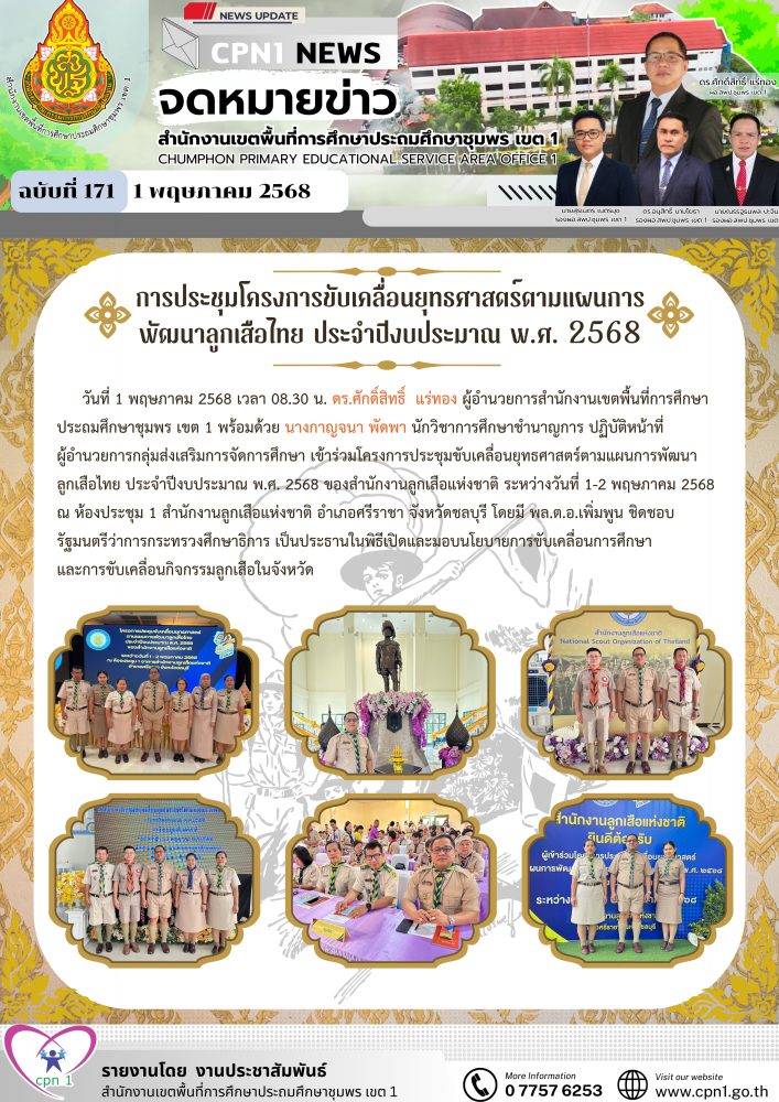 วันที่ 1 พฤษภาคม 2568 เวลา 08.30 น. ดร.ศักดิ์สิทธิ์ แร่ทอง ผู้อำนวยการสำนักงานเขตพื้นที่การศึกษาประถมศึกษาชุมพร เขต 1 พร้อมด้วย นางกาญจนา พัดพา นักวิชาการศึกษาชำนาญการ ปฏิบัติหน้าที่ ผู้อำนวยการกลุ่มส่งเสริมการจัดการศึกษา เข้าร่วมโครงการประชุมขับเคลื่อนยุทธศาสตร์ตามแผนการพัฒนา ลูกเสือไทย ประจำปีงบประมาณ พ.ศ. 2568 ของสำนักงานลูกเสือแห่งชาติ ระหว่างวันที่ 1-2 พฤษภาคม 2568 ณ ห้องประชุม 1 สำนักงานลูกเสือแห่งชาติ อำเภอศรีราชา จังหวัดชลบุรี โดยมี พล.ต.อ.เพิ่มพูน ชิดชอบ รัฐมนตรีว่าการกระทรวงศึกษาธิการ เป็นประธานในพิธีเปิดและมอบนโยบายการขับเคลื่อนการศึกษา และการขับเคลื่อนกิจกรรมลูกเสือในจังหวัด