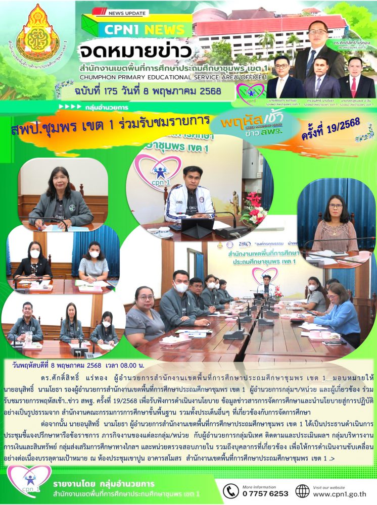 ดร.ศักดิ์สิทธิ์ แร่ทอง ผู้อำนวยการสำนักงานเขตพื้นที่การศึกษาประถมศึกษาชุมพร เขต 1 มอบหมายให้นายอนุสิทธิ์ นามโยธา รองผู้อำนวยการสำนักงานเขตพื้นที่การศึกษาประถมศึกษาชุมพร เขต 1 ผู้อำนวยการกลุ่มฯ/หน่วย และผู้เกี่ยวข้อง ร่วมรับชมรายการพฤหัสเช้า..ข่าว สพฐ. ครั้งที่ 19/2568 เพื่อรับฟังการดำเนินงานโยบาย ข้อมูลข่าวสารการจัดการศึกษาและนำนโยบายสู่การปฏิบัติอย่างเป็นรูปธรรมจาก สำนักงานคณะกรรมการการศึกษาขั้นพื้นฐาน รวมทั้งประเด็นอื่นๆ ที่เกี่ยวข้องกับการจัดการศึกษา